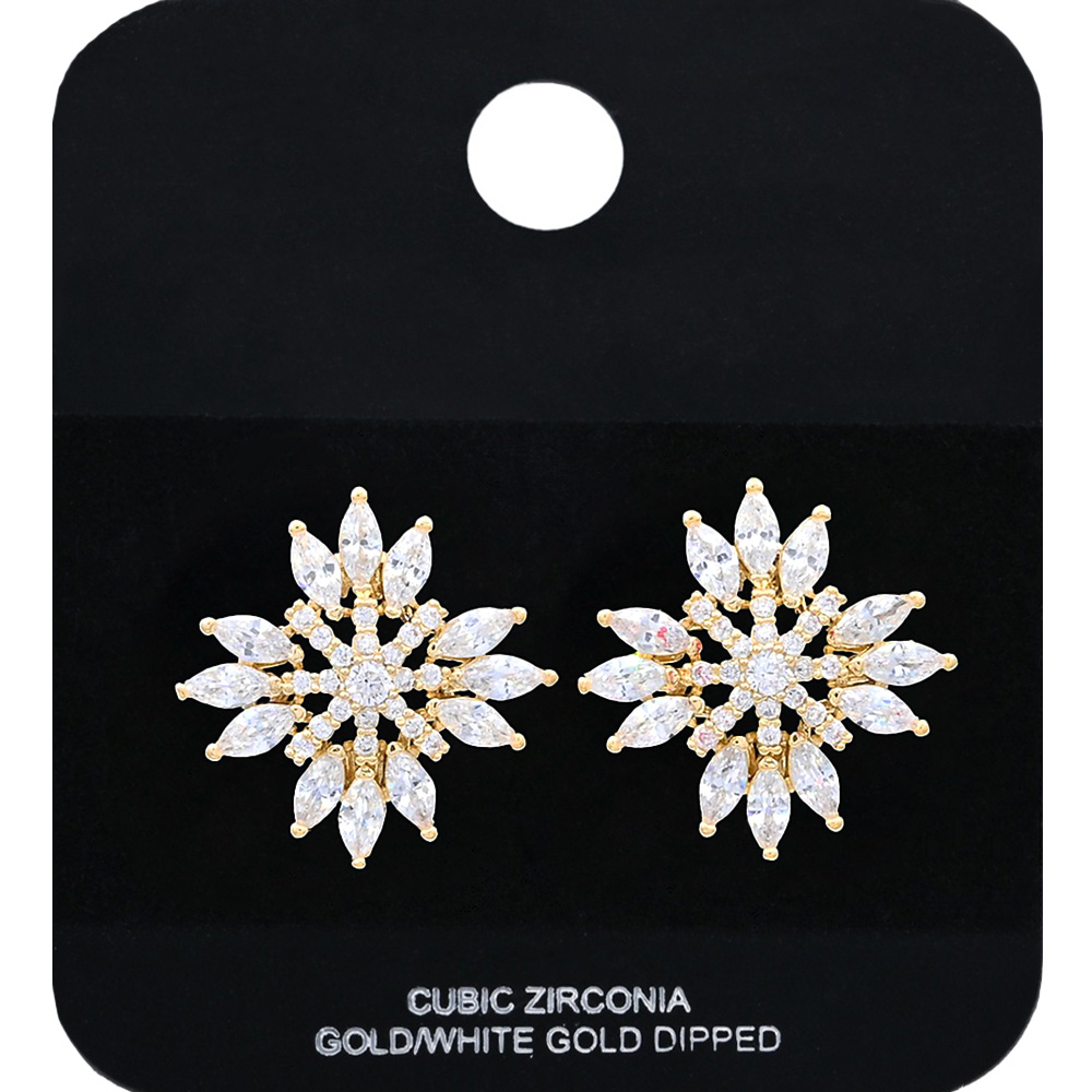 Details • Size : 0.75" X 0.75" • Post Back • Add dazzling brilliance to your style with these radiant snowflake cubic zirconia stud earrings. Their sparkling arrangement creates a bold yet graceful look, perfect for everyday wear or special occasions. A timeless accessory to elevate your jewelry collection. • CZ Cubic Zirconia • Gold Dipped • Lead and Nickel Compliant
