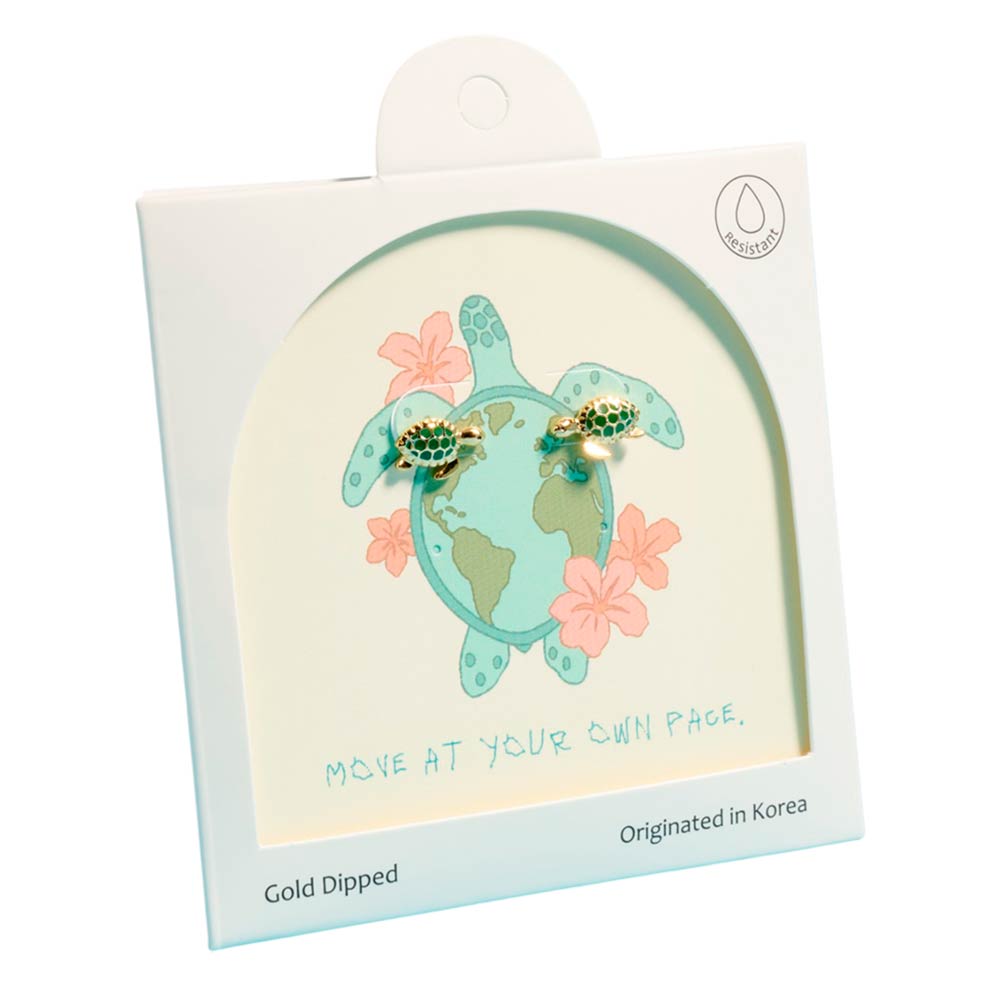 Details • Size : 0.25" X 0.25" • Post Back • Sea turtle stud earrings inspired by ocean life and slow, mindful living. These petite studs add a playful coastal accent to everyday outfits, vacation looks, and giftable jewelry displays. Ideal for beach themes, summer styling, and animal-inspired collections. • Hypoallergenic • Made In Korea • Gold Dipped