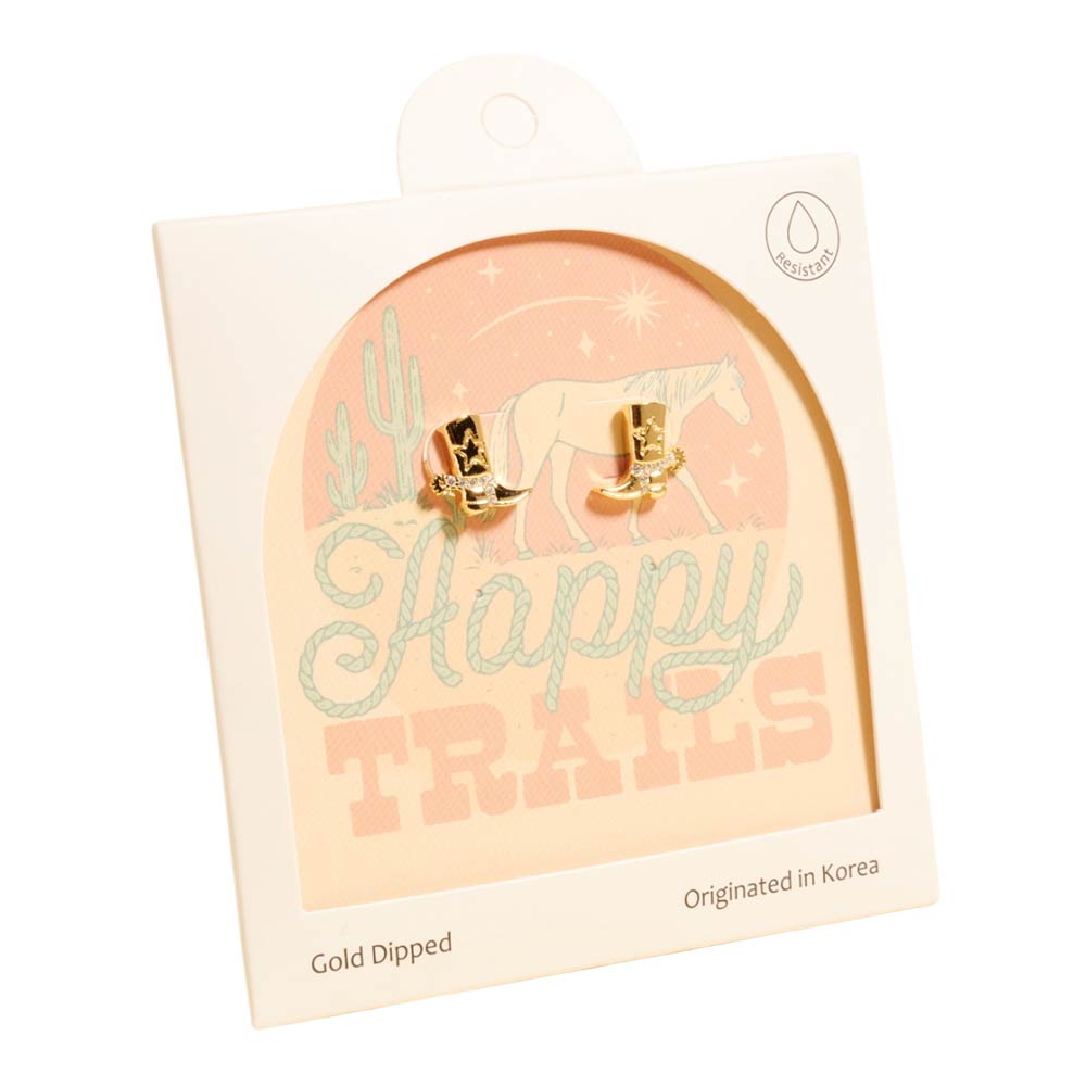 Details • Size : 0.4" X 0.4" • Post Back • Cowboy boot stud earrings inspired by western style and happy trails themes. These playful studs add a rustic accent to everyday outfits, rodeo looks, festivals, and gift assortments. Ideal for western boutiques, novelty jewelry collections, and customers who love country-inspired accessories. • Gold Dipped • Hypoallergenic • Made In Korea