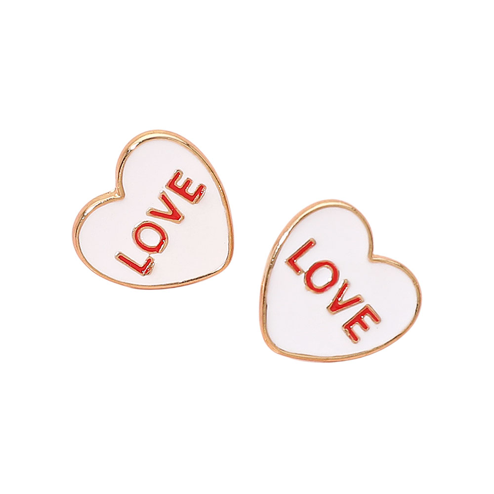 Details • Size : 0.6" X 0.6" • Post Back • Playful heart stud earrings featuring a bold LOVE motif with a sleek, modern silhouette that adds charm and personality to any outfit. Perfect for everyday styling or special moments, these lightweight statement studs bring a fun, romantic touch to both casual and dressed-up looks. • Lead and Nickel Compliant