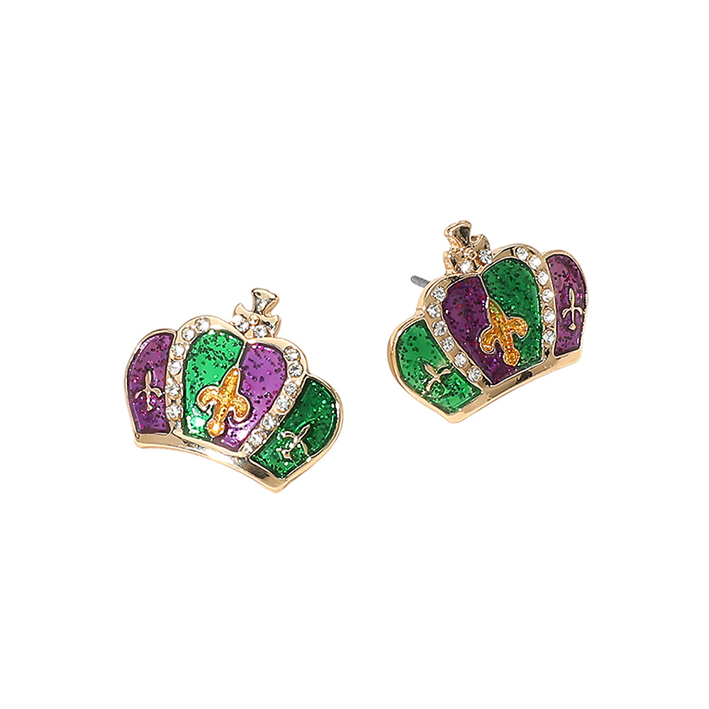 Details • Size : 0.7" X 0.5" • Post Back • These Mardi Gras crown stud earrings feature a festive crown motif designed for parade outfits, themed events, and seasonal celebrations. A playful yet polished accessory for party looks, gift shops, and holiday collections, they are easy to wear and perfect for adding a bold, celebratory accent to Mardi Gras–inspired jewelry assortments. • Lead and Nickel Compliant