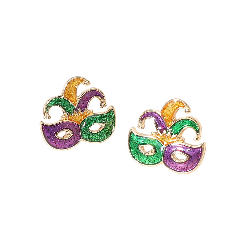 Details • Size : 0.7" X 0.7" • Post Back • These Mardi Gras mask stud earrings showcase a festive mask design inspired by parade celebrations and party traditions. Ideal for seasonal events, themed outfits, and holiday gifting, they add playful charm to any look. A great choice for boutiques, gift shops, and Mardi Gras jewelry collections seeking bold, celebratory accessories. • Lead and Nickel Compliant