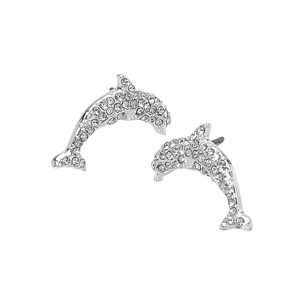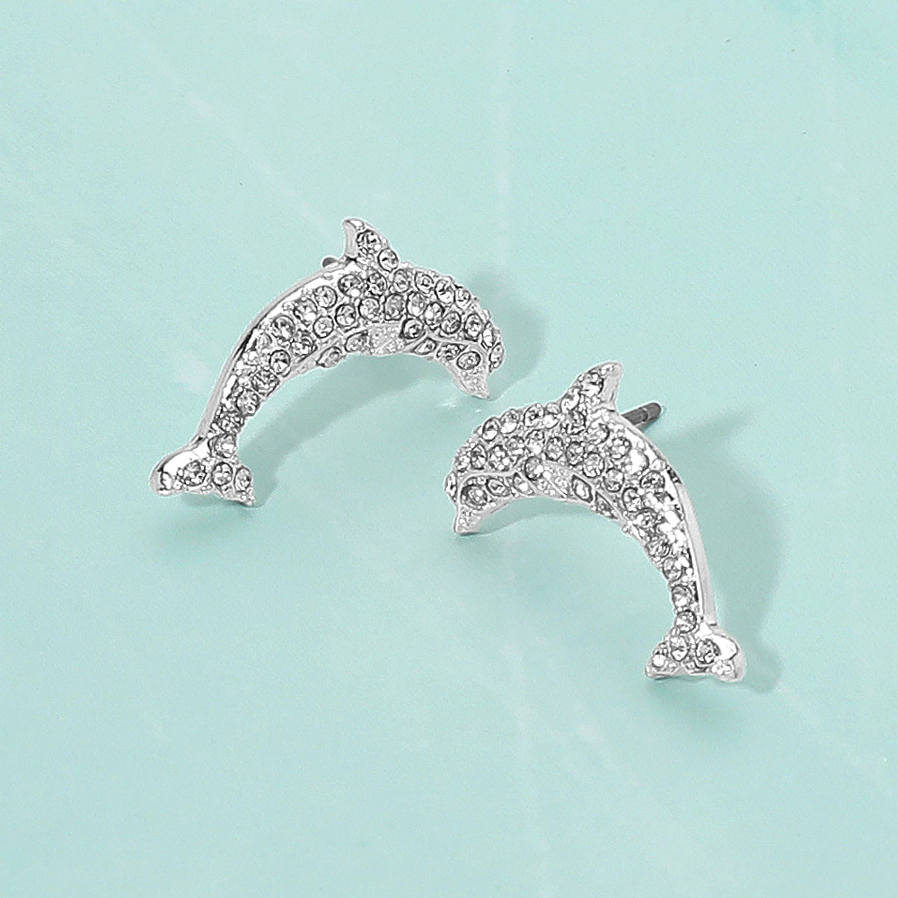 • Charming dolphin-shaped stud earrings encrusted with sparkling crystals. A fun and elegant ocean-inspired accessory ideal for casual wear or gifting to sea life enthusiasts.