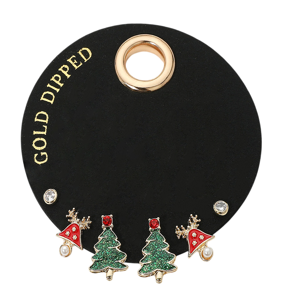Details • Size : 0.1" - 0.7" L • Post Back • Gold dipped earring set showcasing glittery Christmas tree studs, reindeer-accented festive hats, and sparkling crystal studs, perfect for adding cheerful holiday spirit to your seasonal style. • Gold Dipped