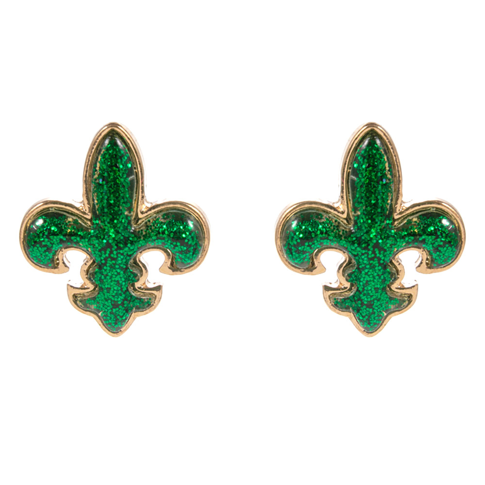 Details • Size : 0.7" X 0.75" • Titanium Post Back • Stylish fleur-de-lis stud earrings featuring a shimmering glitter accent for a festive and bold look. Perfect for celebrations, themed events, or everyday sparkle, these earrings bring charm and personality to any outfit, offering a unique touch of vibrant and elegant style. • Hypoallergenic • Lead and Nickel Compliant