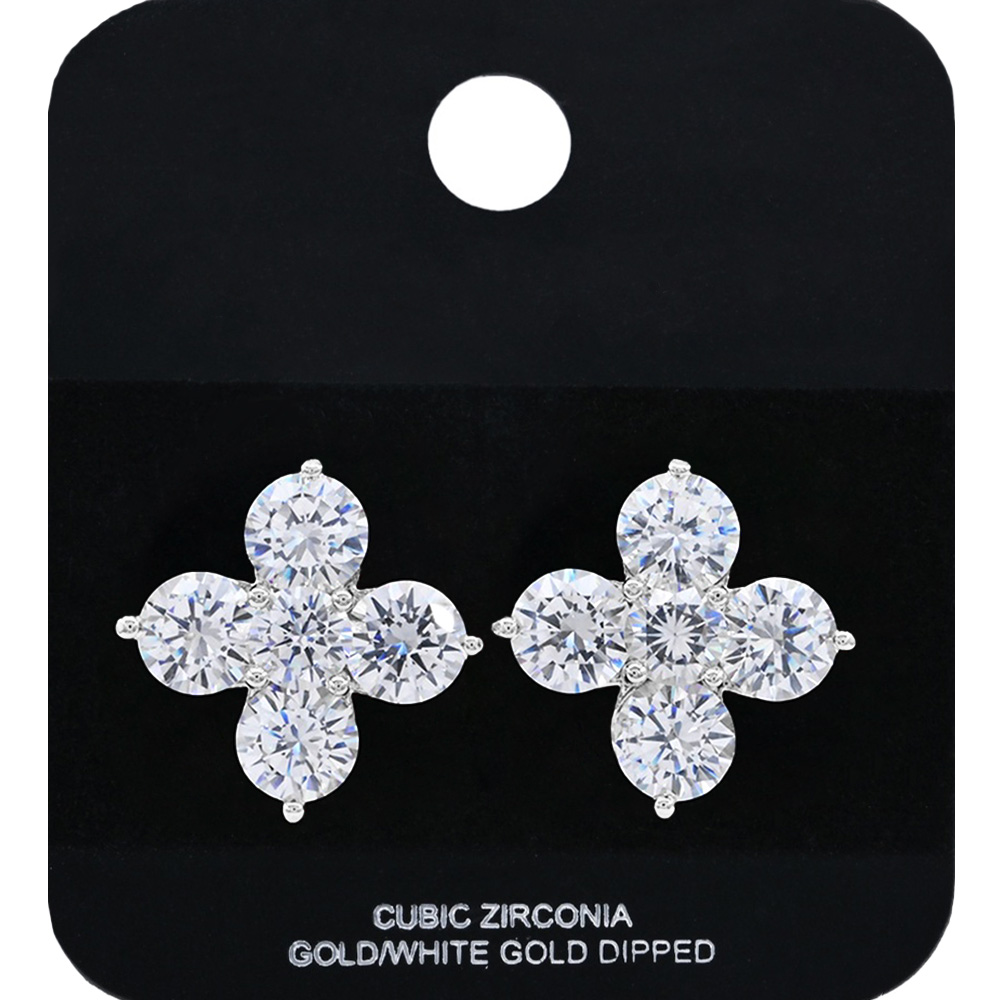 White Gold Dipped CZ Stone Cluster Clover Stud Earrings