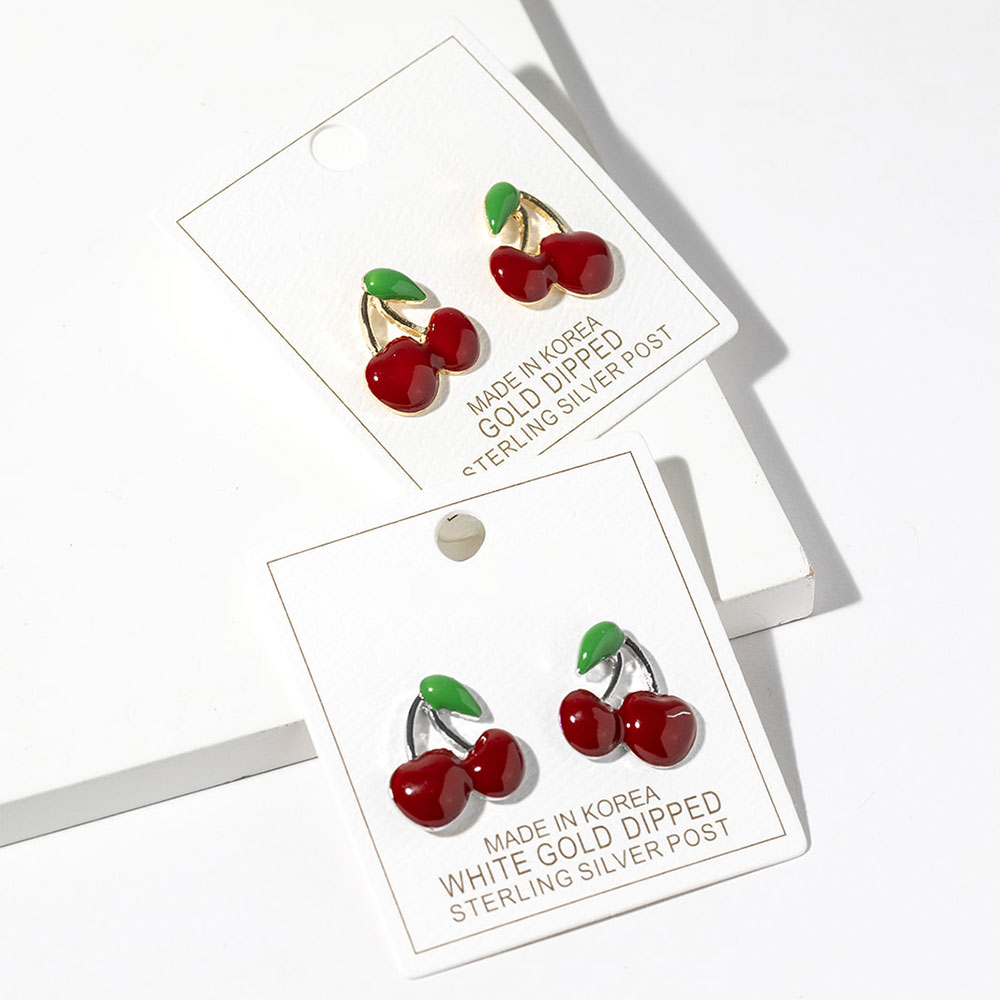 • Playful cherry stud earrings featuring a glossy fruit-inspired silhouette with a smooth leaf accent. These charming studs add a fun, youthful touch to everyday outfits while remaining easy to style for casual looks, seasonal collections, or novelty jewelry displays that need a lighthearted yet polished statement.