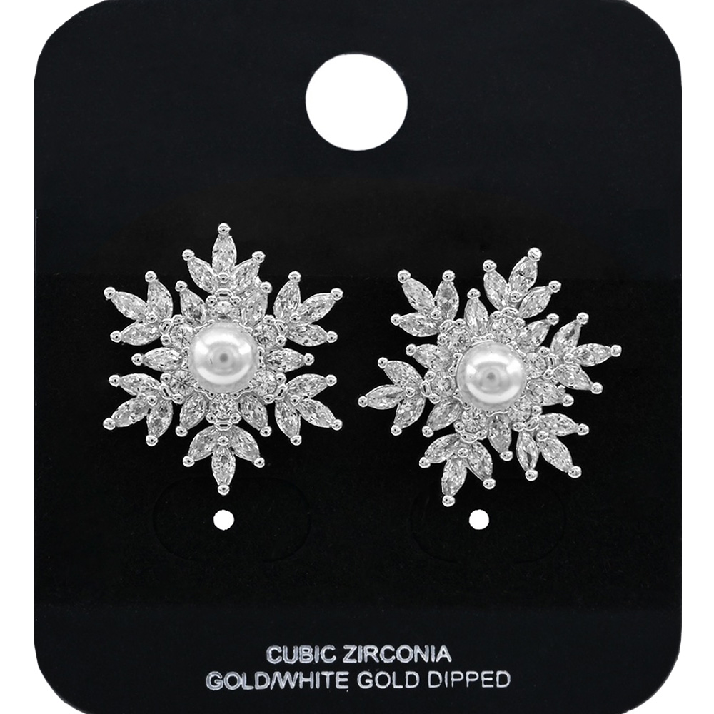 White Gold Dipped Pearl Accent CZ Stone Snowflake Stud Earrings