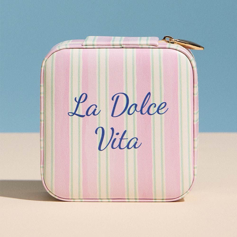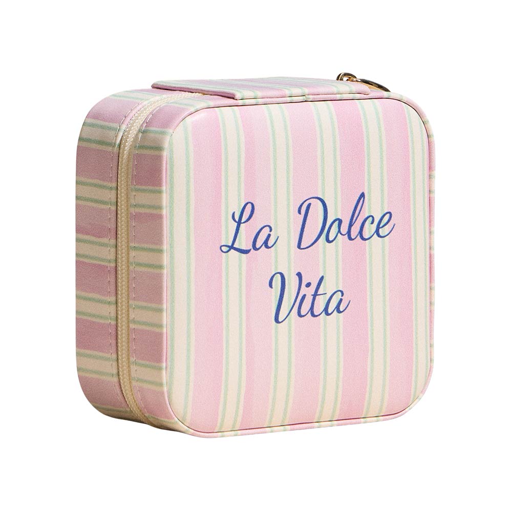 Details • Size : 3.5" X 3.5" X 2" • Zipper Closure • Stylish mini zip pouch featuring a charming “La Dolce Vita” design, perfect for organizing small essentials on the go. Ideal for travel, handbags, or gifting, this compact case keeps jewelry, coins, and daily accessories neatly stored with a fun, lifestyle-inspired touch.