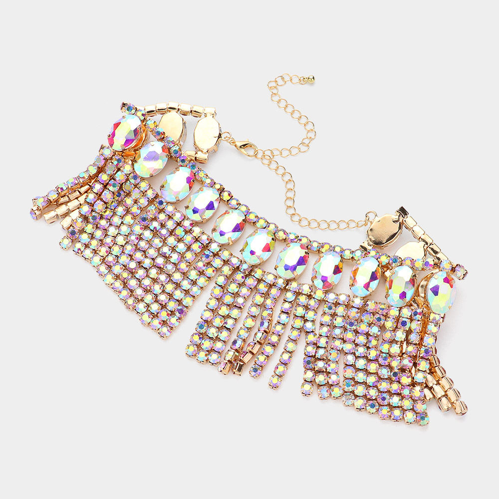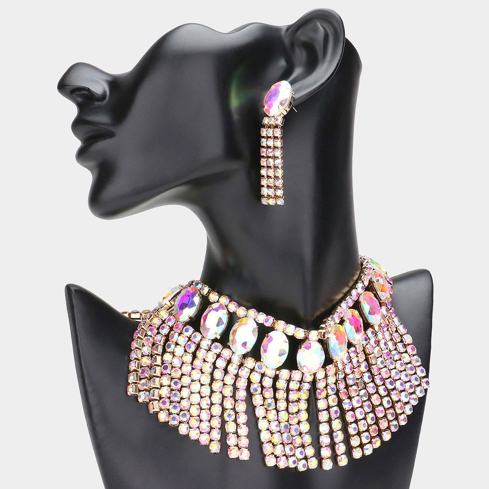 Oval Glass Stone Cluster Accented Round Stone Cluster Fringe Evening Choker Necklace