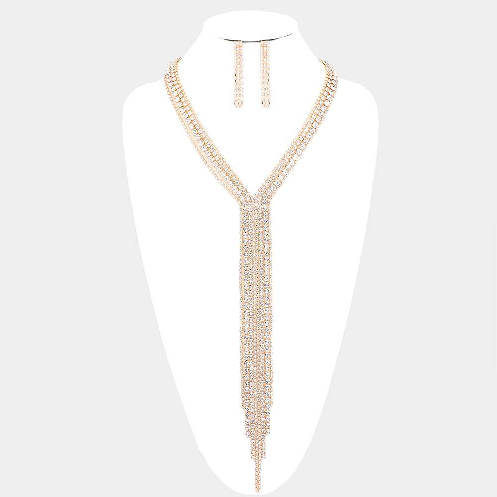 Rhinestone Paved Fringe V Shaped Necklace Jewelry Set
