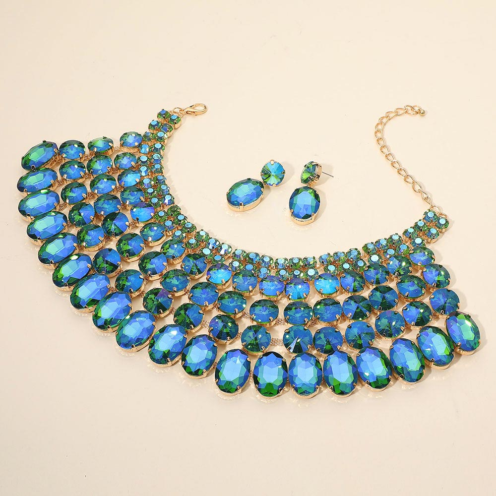 • Dramatic bib necklace and earring set featuring layered oval stones arranged in a bold cascading design. Perfect for weddings, galas, performances or any occasion that calls for standout glamour. An eye-catching accessory set that elevates formal and evening looks.