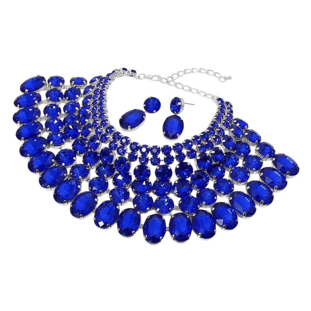 Details • Necklace Size: 13" + 4" L • Decor Size: 3.7" L • Earring Size: 1.75" L • Dramatic bib necklace and earring set featuring layered oval stones arranged in a bold cascading design. Perfect for weddings, galas, performances or any occasion that calls for standout glamour. An eye-catching accessory set that elevates formal and evening looks.