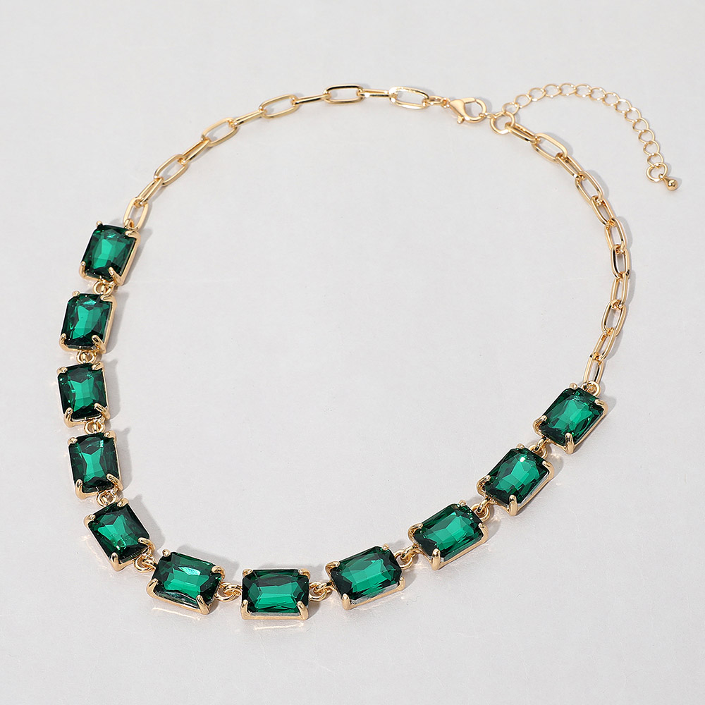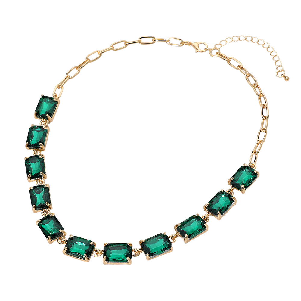 Details • Necklace Size : 16" + 2.5" L • Decor Size : 0.4" L • This elegant gemstone chain necklace features a row of precisely cut stones linked with a sleek chain for a refined, modern look. Its adjustable closure ensures a comfortable fit, making it a sophisticated accessory for formal occasions, evening wear, or adding a statement touch to everyday style. • Lead and Nickel Compliant
