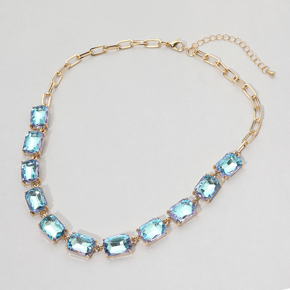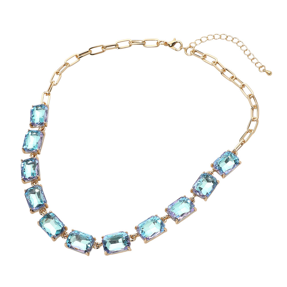 • This elegant gemstone chain necklace features a row of precisely cut stones linked with a sleek chain for a refined, modern look. Its adjustable closure ensures a comfortable fit, making it a sophisticated accessory for formal occasions, evening wear, or adding a statement touch to everyday style.