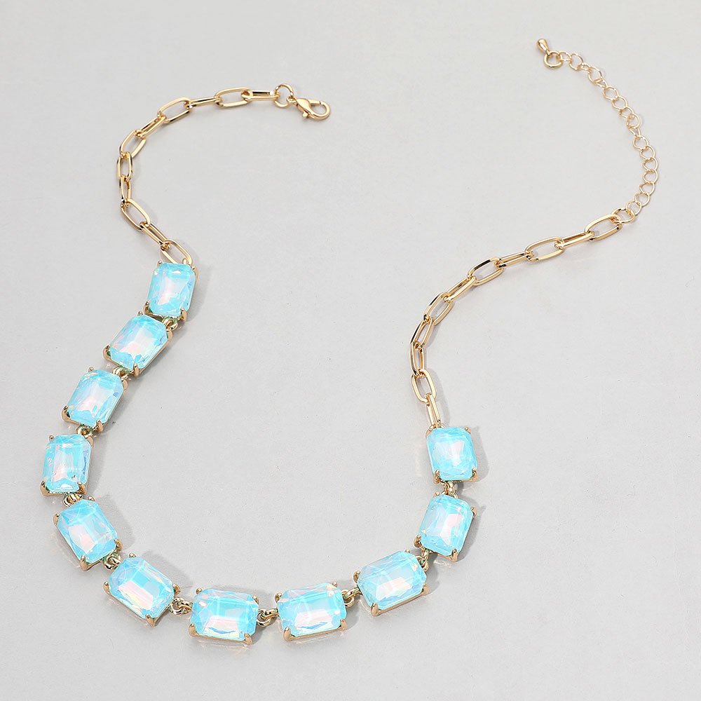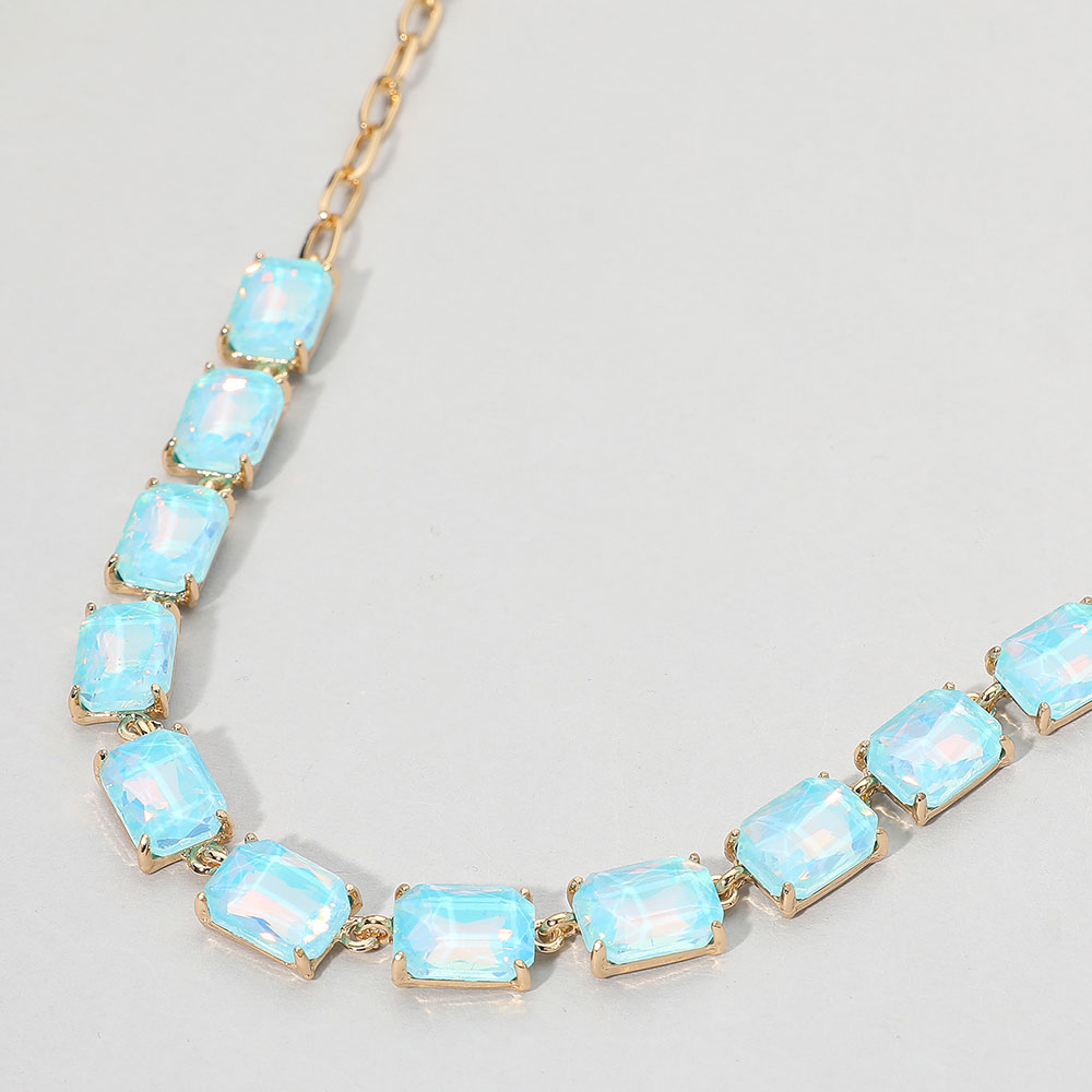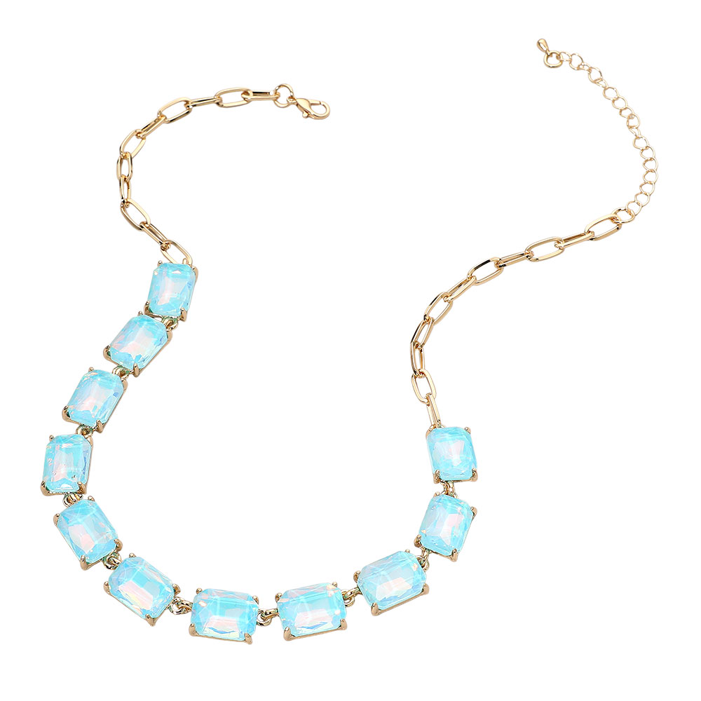 • This elegant gemstone chain necklace features a row of precisely cut stones linked with a sleek chain for a refined, modern look. Its adjustable closure ensures a comfortable fit, making it a sophisticated accessory for formal occasions, evening wear, or adding a statement touch to everyday style.