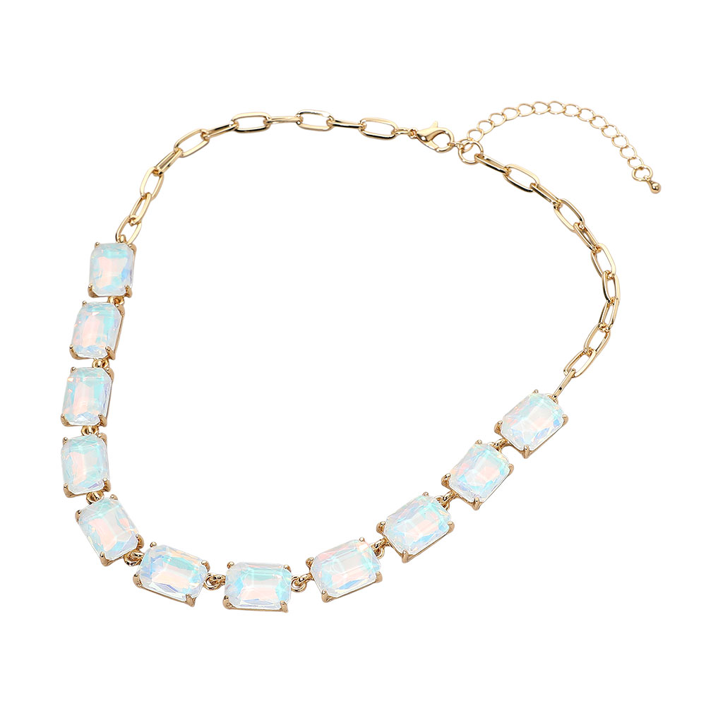 • This elegant gemstone chain necklace features a row of precisely cut stones linked with a sleek chain for a refined, modern look. Its adjustable closure ensures a comfortable fit, making it a sophisticated accessory for formal occasions, evening wear, or adding a statement touch to everyday style.