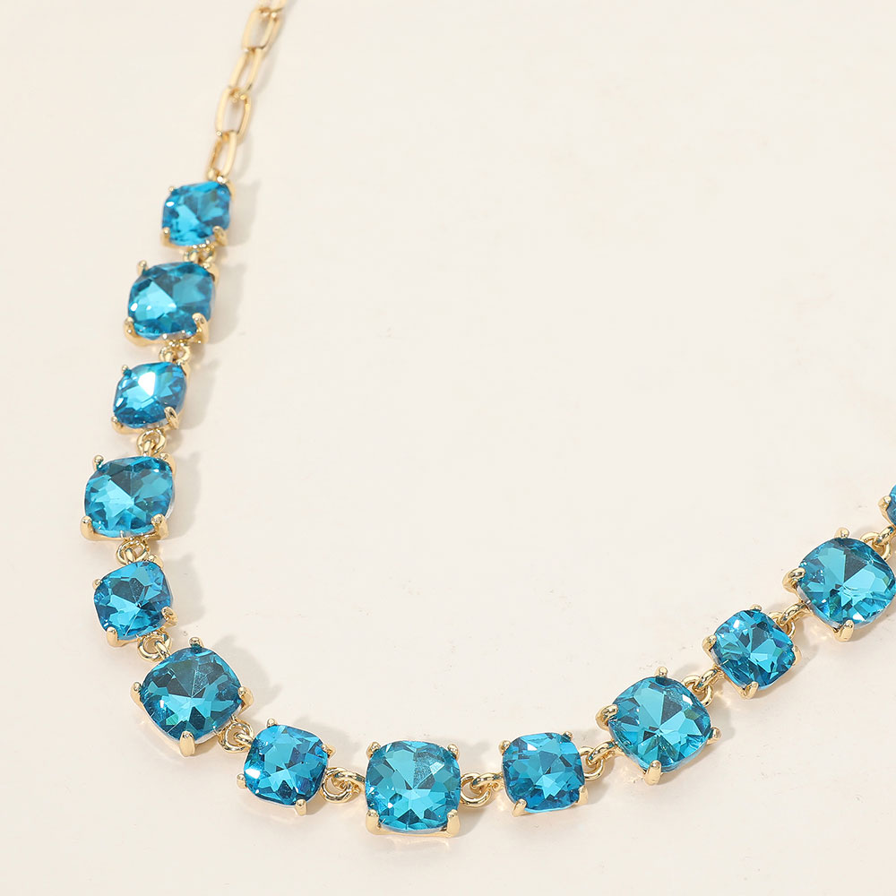 Details • Necklace Size : 16" + 2.75" L • Decor Size : 0.5" L • Elevate your style with this stunning square cut gemstone statement necklace. Featuring shimmering faceted stones linked in a classic design, it offers a chic adjustable fit. Perfect for evening wear, weddings, parties, or adding a sophisticated sparkle to your everyday look. • Lead and Nickel Compliant