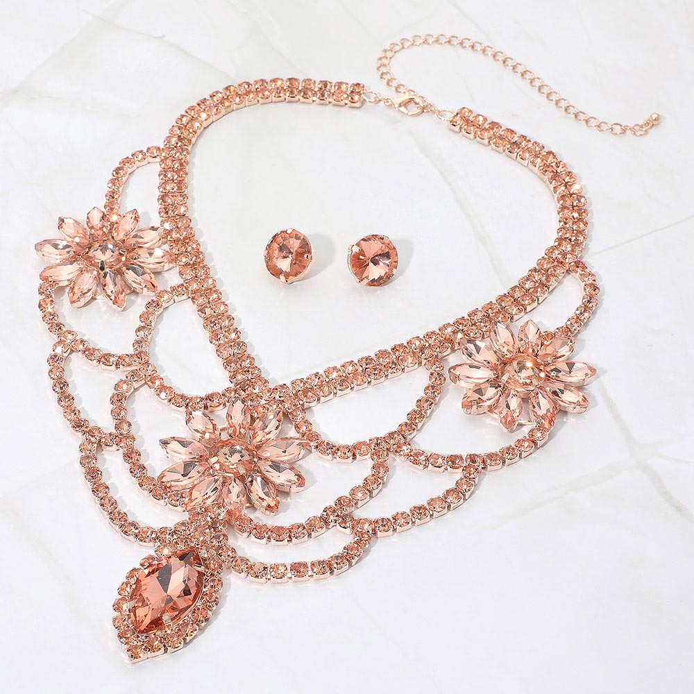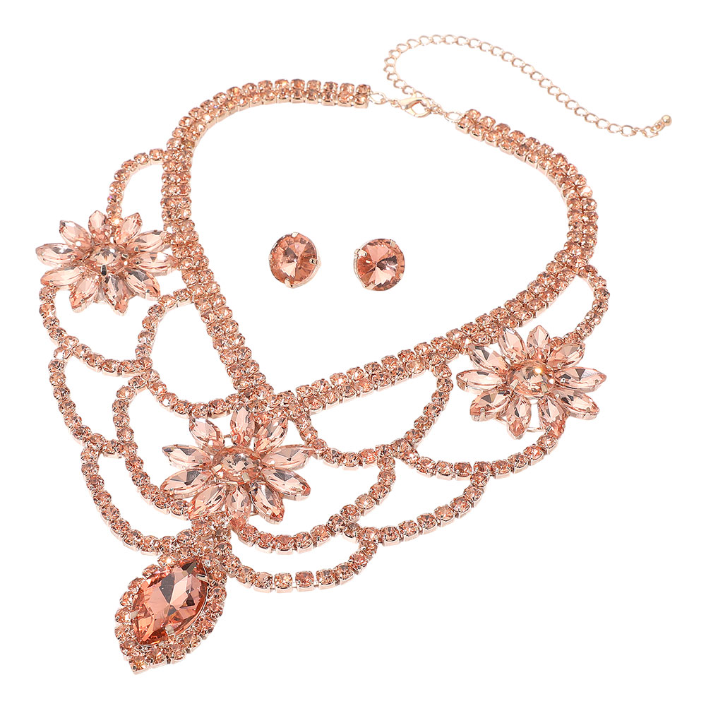 • Glamorous statement bib necklace and earring set featuring bold floral crystal clusters and cascading layered detailing. Designed to elevate evening looks, special events, and formal occasions with eye-catching sparkle and dramatic elegance perfect for standout styling.