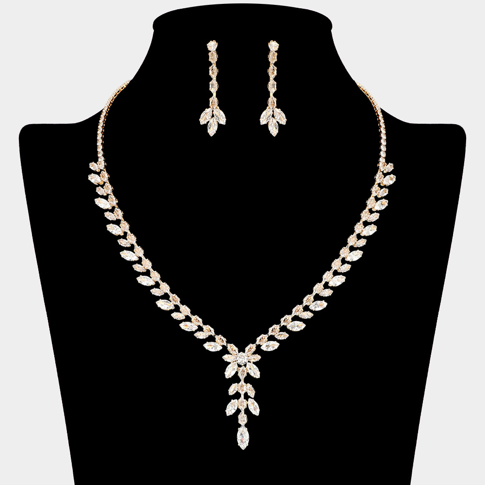 • Elegant leaf vine necklace and earring set featuring marquise-cut cz stones arranged in a cascading pattern. The graceful drop design adds refined sparkle, perfect for weddings, formal occasions, and sophisticated evening looks.