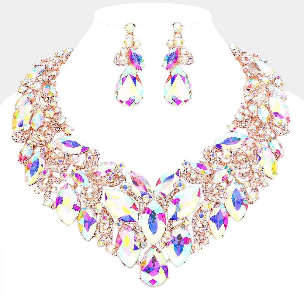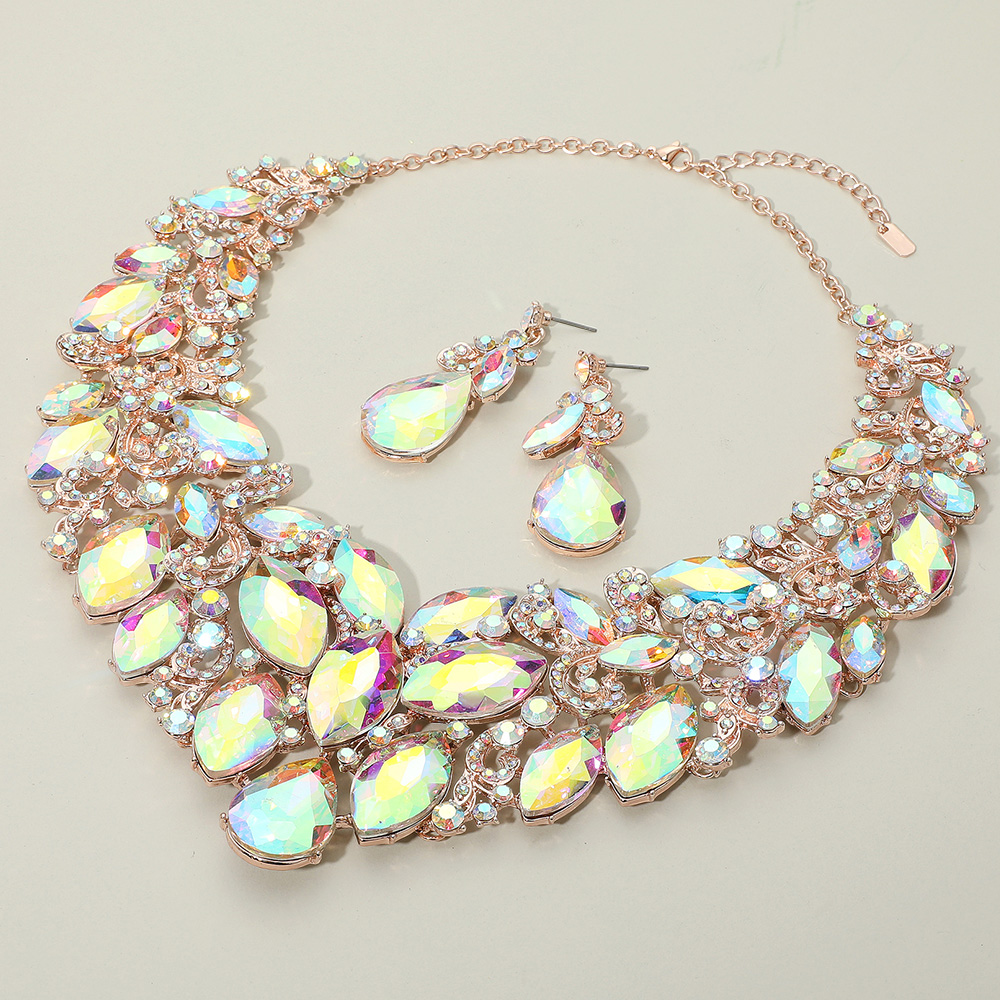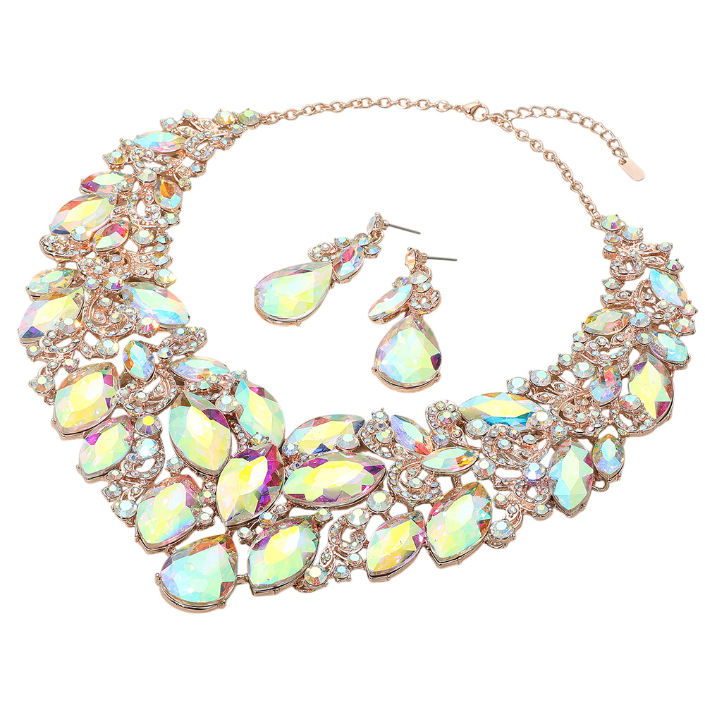 • This elegant jewelry set features a crystal-embellished statement necklace with teardrop accents, paired with matching drop earrings. Designed for maximum sparkle, it’s perfect for weddings, galas, and other formal events where you want to shine.