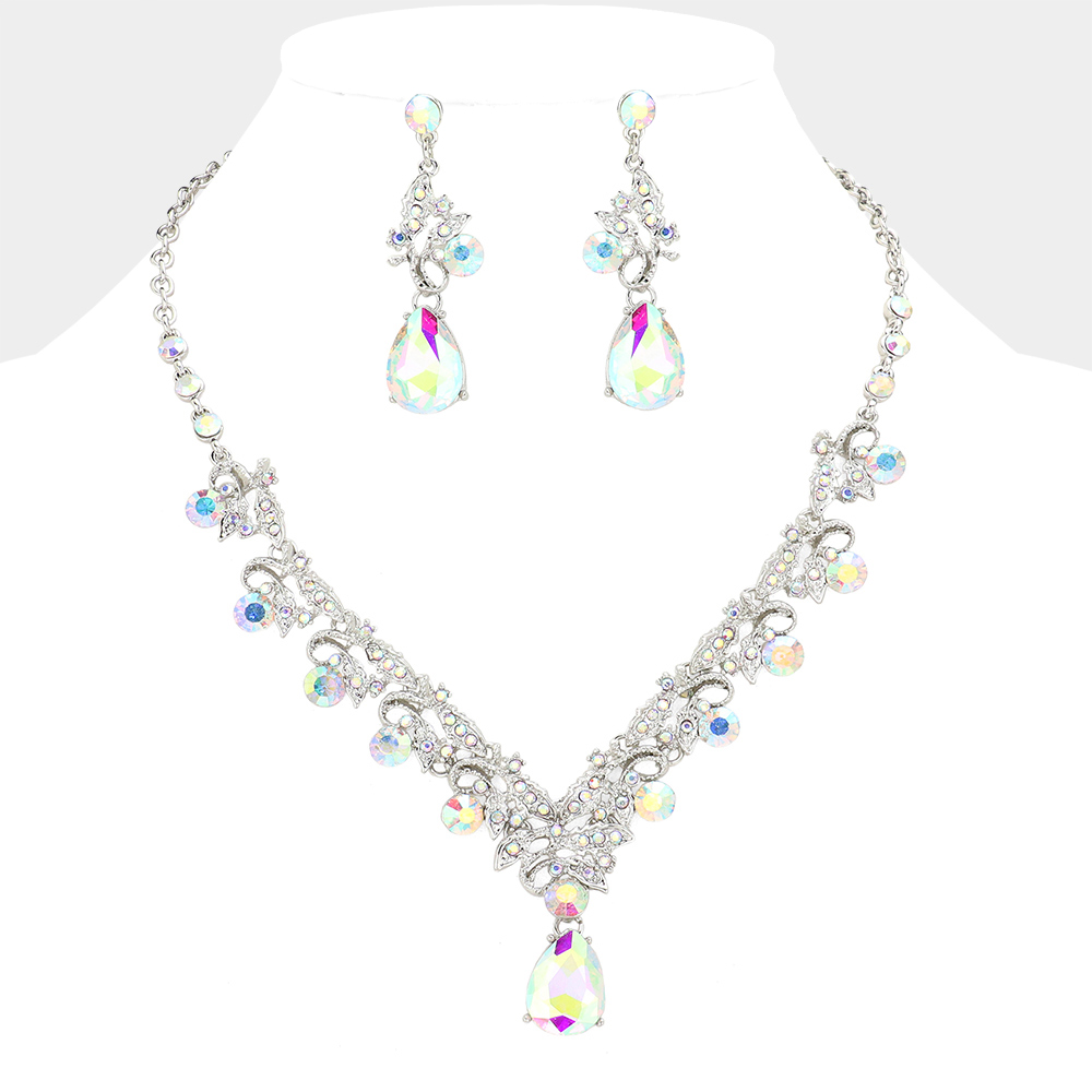 Teardrop Round Stone Accented Leaf Evening Necklace