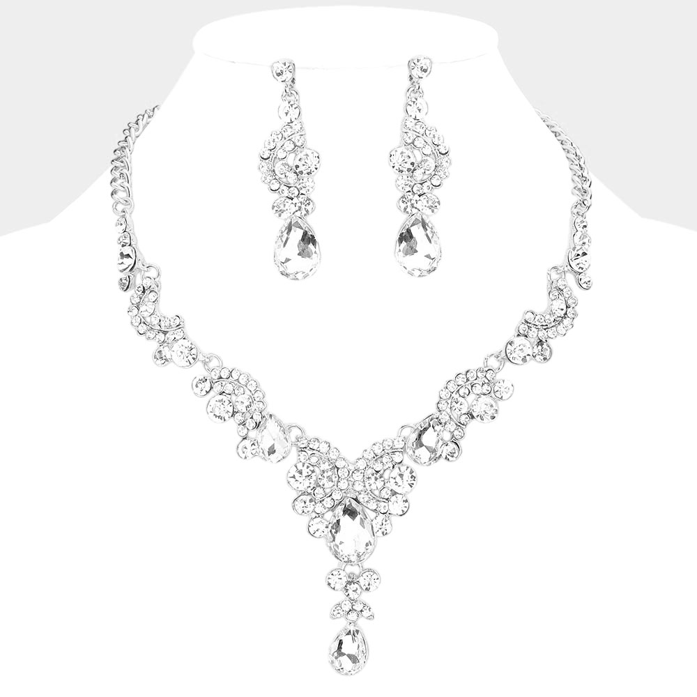 • Stunning teardrop crystal necklace and earring set designed with intricate clustered detailing and sparkling stones. Features a graceful V-shaped centerpiece and matching drop earrings, perfect for formal events, weddings, parties, and special occasions. A glamorous statement set that elevates any outfit.