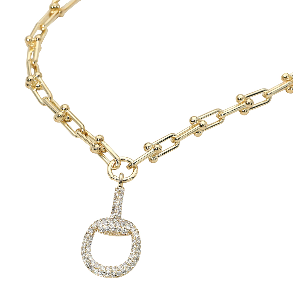 Details • Necklace Size : 17.5" + 2" L • Decor Size : 0.3" L • Pendant Size : 0.8" X 2" • Statement necklace featuring a half horsebit pendant accented with CZ-style detailing and a modern link chain design. The geometric pendant creates a sleek focal point while the structured chain adds balance and edge. Ideal for everyday wear, layering looks, boutique assortments, and gift-ready jewelry collections. • CZ Cubic Zirconia • Gold Dipped