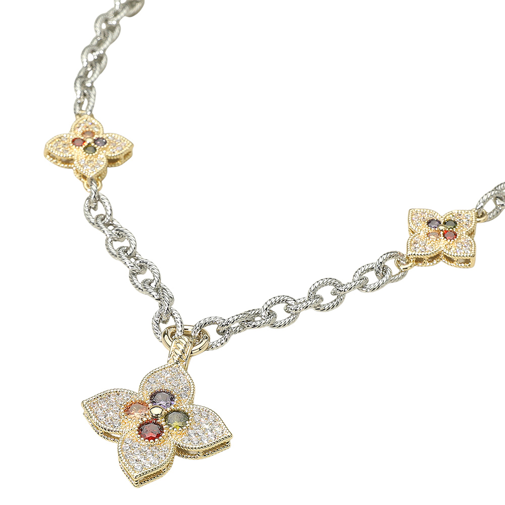 Details • Necklace Size : 16.75" + 2.25" L • Decor Size : 0.75" L • Pendant Size : 1.25" X 1.5" • Add sophistication to your style with this two-tone floral necklace featuring sparkling crystal details and vibrant multi-stone accents. Perfect for evening wear, special events, or as a thoughtful gift, it blends timeless elegance with a modern statement look. • CZ Cubic Zirconia • Gold Dipped