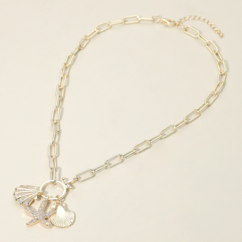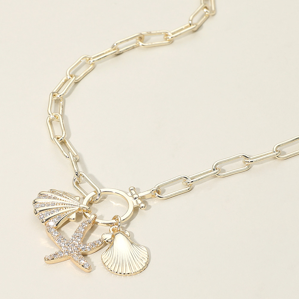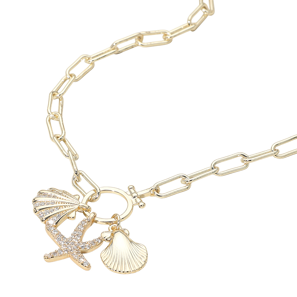 Details • Necklace Size : 17.75" + 2.25" L • Pendant Size : 1.2" X 1.5" • Bring a touch of seaside elegance to your style with this chain-link necklace featuring a trio of coastal-inspired charms, including a shimmering star detail and two sculpted shell accents. Its playful yet refined design adds personality and shine to both everyday looks and vacation-ready outfits. • CZ Cubic Zirconia • Gold Dipped