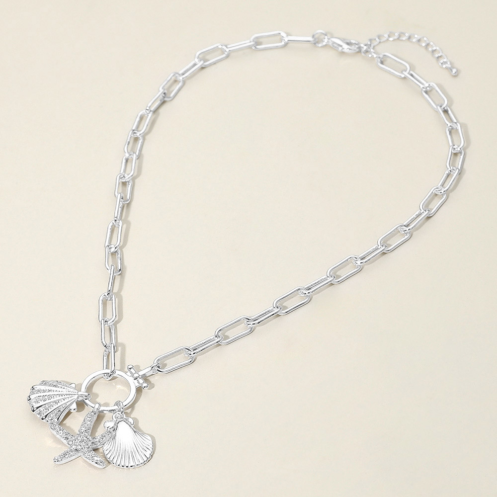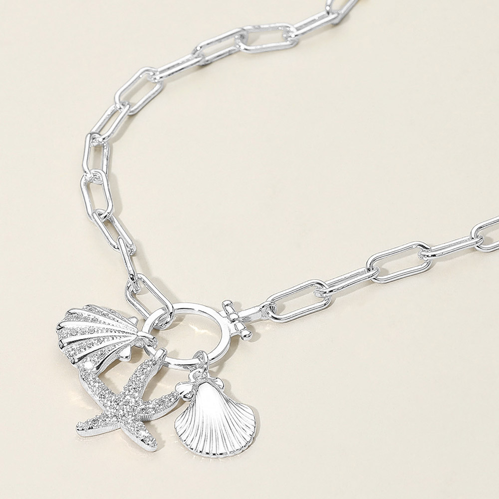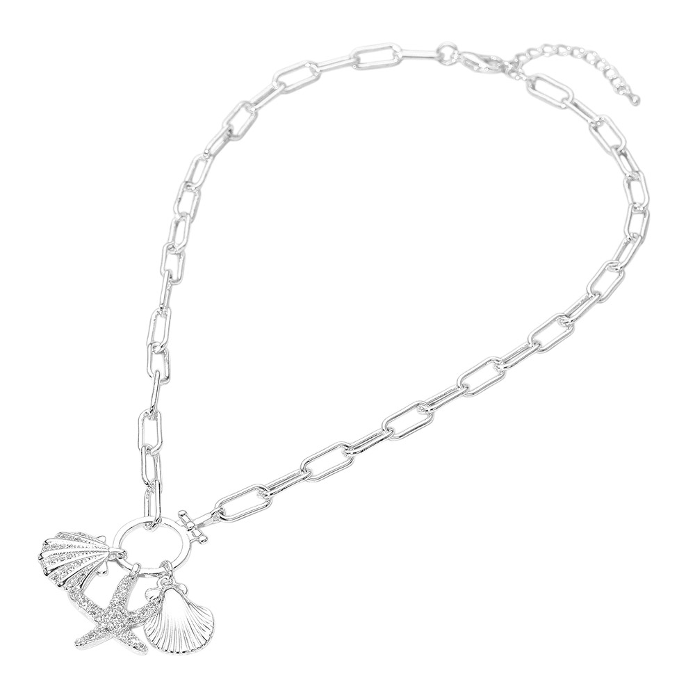 • Bring a touch of seaside elegance to your style with this chain-link necklace featuring a trio of coastal-inspired charms, including a shimmering star detail and two sculpted shell accents. Its playful yet refined design adds personality and shine to both everyday looks and vacation-ready outfits.