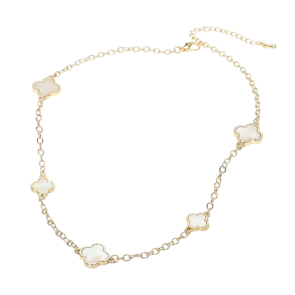 Details • Necklace Size : 16.5" + 2" L • Decor Size : 0.6" L • Elevate your style with this chic quatrefoil station necklace, crafted with a sleek silhouette and timeless charm. Its delicate linked design offers a refined accent for both casual and elegant looks, making it an effortless piece to layer or wear alone for everyday sophistication. • Gold Dipped