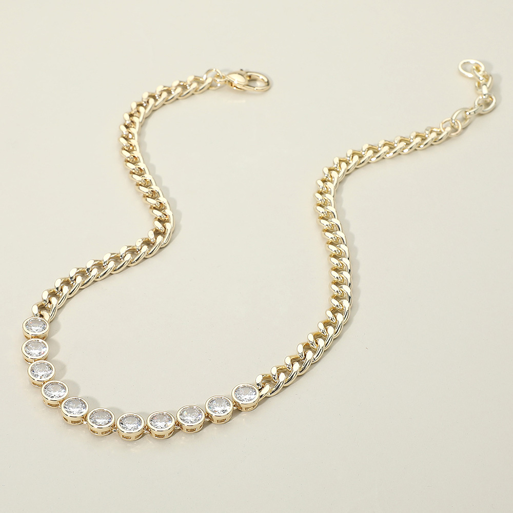 Details • Necklace Size : 17.75" + 2" L • Decor Size : 0.3" L • Sleek chain necklace accented with evenly spaced round cz stones for a clean, modern look. Designed to add subtle sparkle, this piece works effortlessly for everyday wear or layered styling, offering timeless appeal and versatility for trend-forward accessory collections. • CZ Cubic Zirconia • Gold Dipped