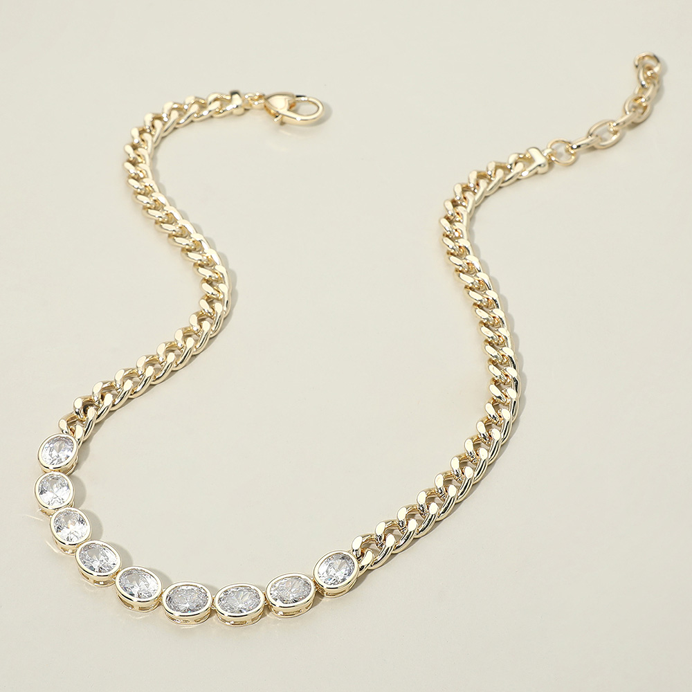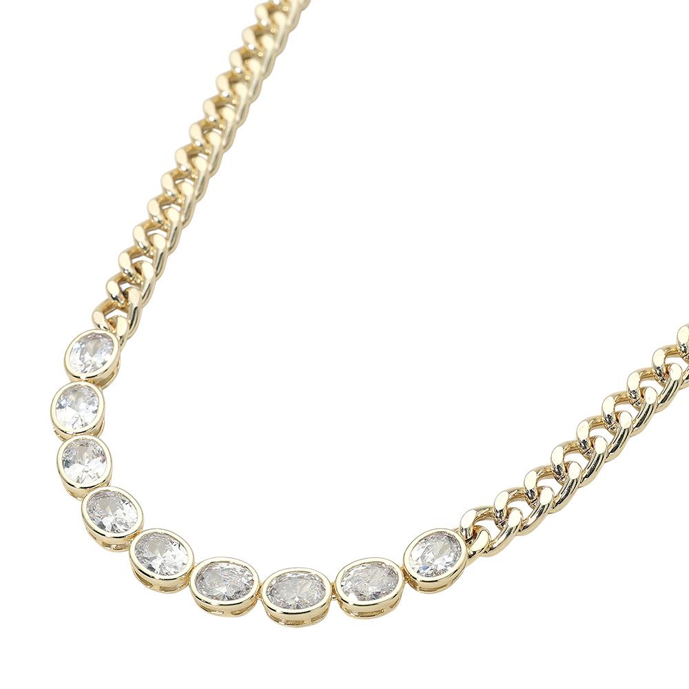 Details • Necklace Size : 17" + 2.25" L • Decor Size : 0.3" L • Chain link necklace featuring a row of evenly spaced round stone details for added dimension and shine. Designed to stand alone or layer easily, this necklace offers a refined, modern look ideal for everyday wear, gifting, and boutique jewelry collections. • CZ Cubic Zirconia • Gold Dipped