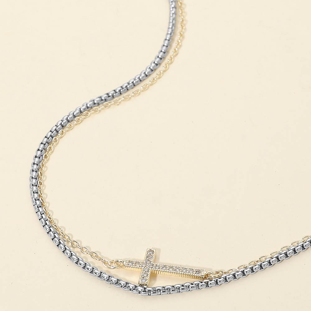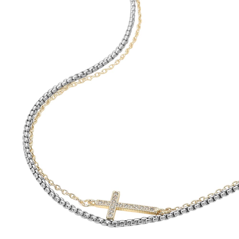 14K Gold Plated Two Tone CZ Pave Cross Pendant Accent Layered Necklace