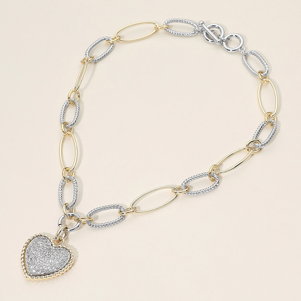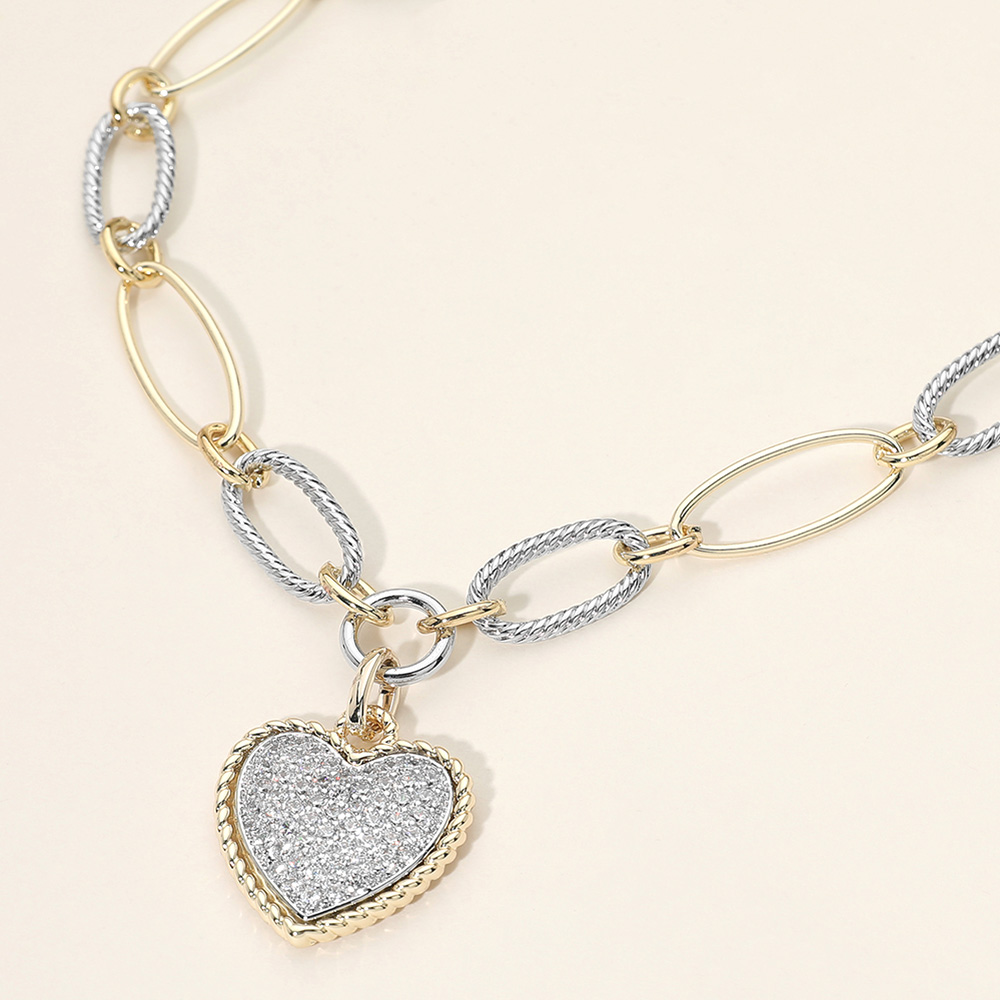 Details • Necklace Size : 15.5" + 1" L • Decor Size : 0.4" L • Pendant Size : 1" X 1.5" • Statement necklace designed with mixed link styling and a textured heart charm accented with subtle sparkle detail. Created to stand out while remaining easy to wear, this necklace works well as a solo piece or layered look, making it ideal for everyday styling and gift-ready jewelry collections. • CZ Cubic Zirconia • Gold Dipped