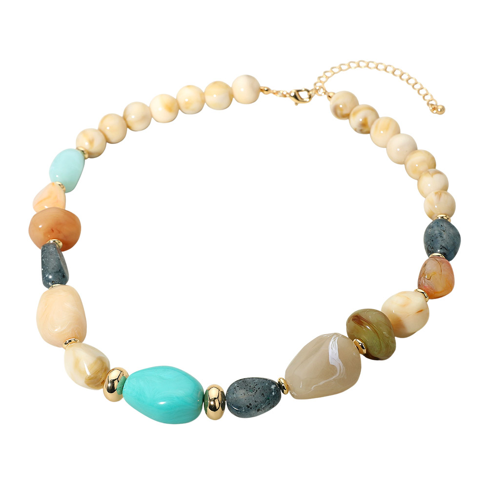Details • Necklace Size : 18" + 3" L • Decor Size : 0.8" L • Elevate your style with this 18" beaded necklace featuring a mix of smooth round and chunky polished stones. Accented with metallic spacers for added shine, this statement piece blends organic charm with modern elegance, making it perfect for everyday wear or special occasions. • Gold Dipped • Lead and Nickel Compliant • Made In Korea