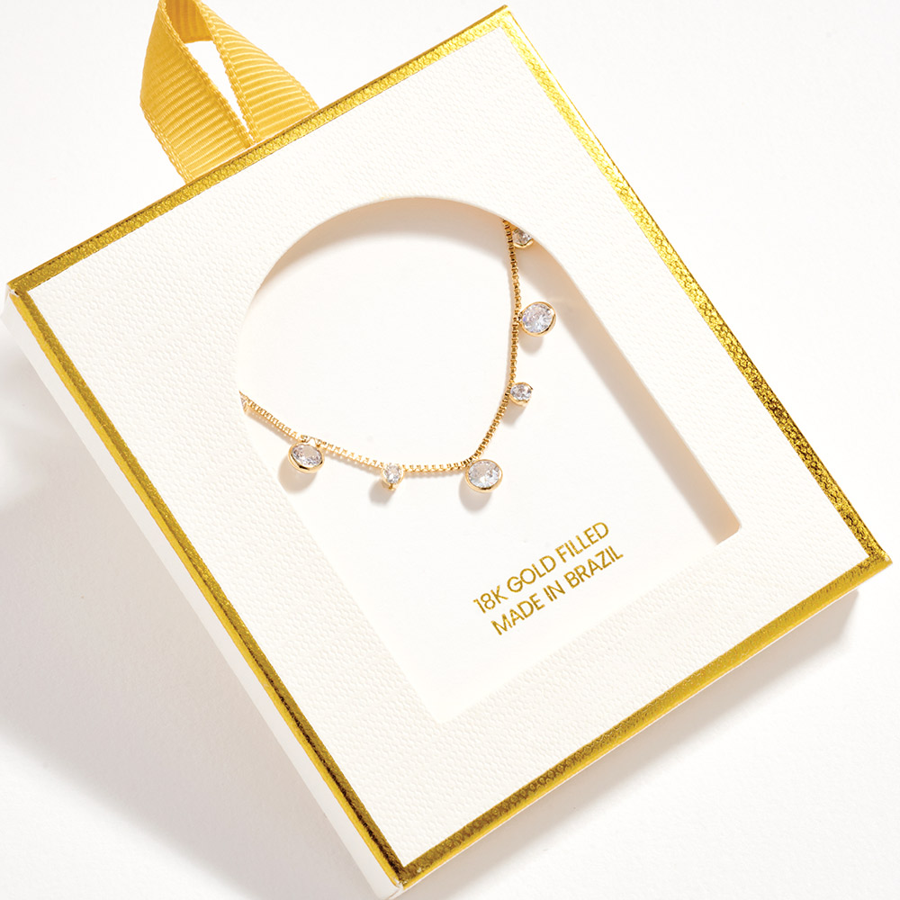 Details • Necklace Size : 14.25" + 4" L • Decor Size : 0.25" L • This box chain station necklace features evenly spaced cz bezel pendant accents along a sleek, structured chain for a refined yet modern look. Designed for easy layering or standalone wear, it adds subtle sparkle and balance to everyday styles, making it ideal for boutique displays and gift-ready jewelry collections. • CZ Cubic Zirconia • Gold Filled • Hypoallergenic • Lead and Nickel Compliant • Made In Brazil