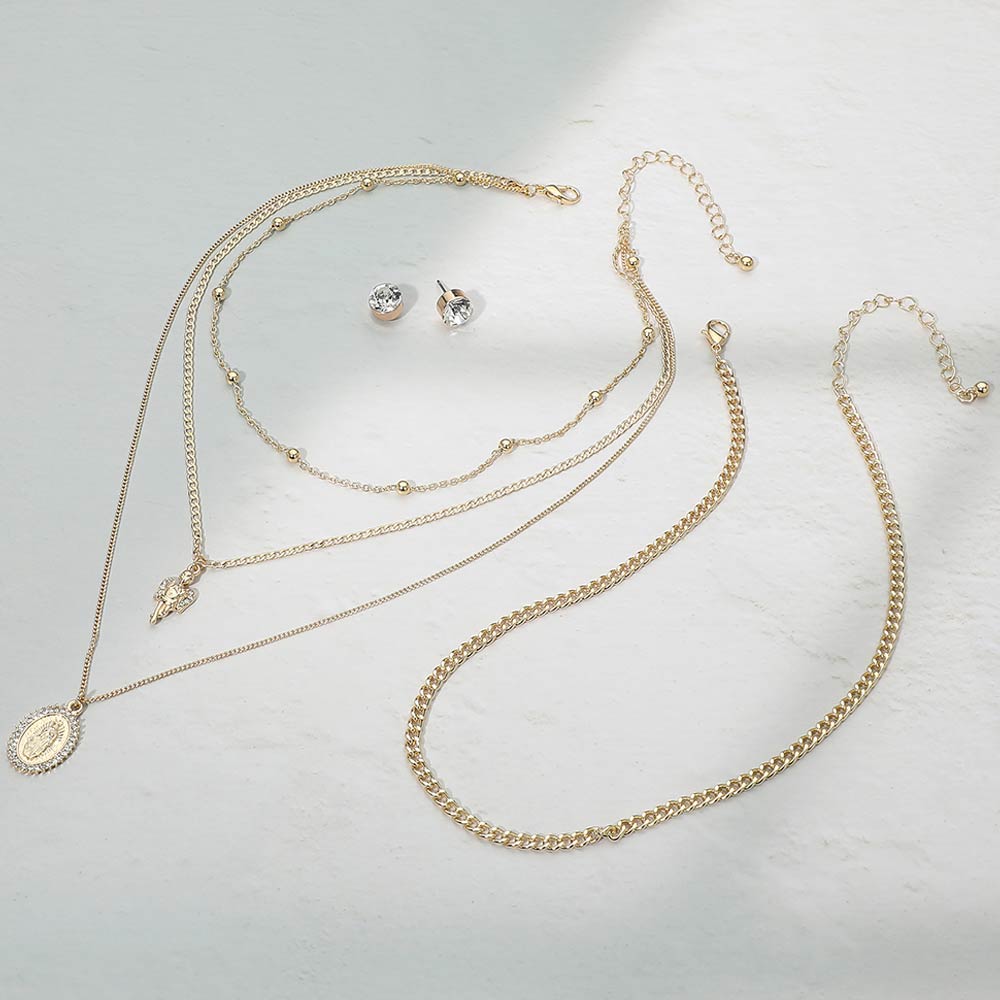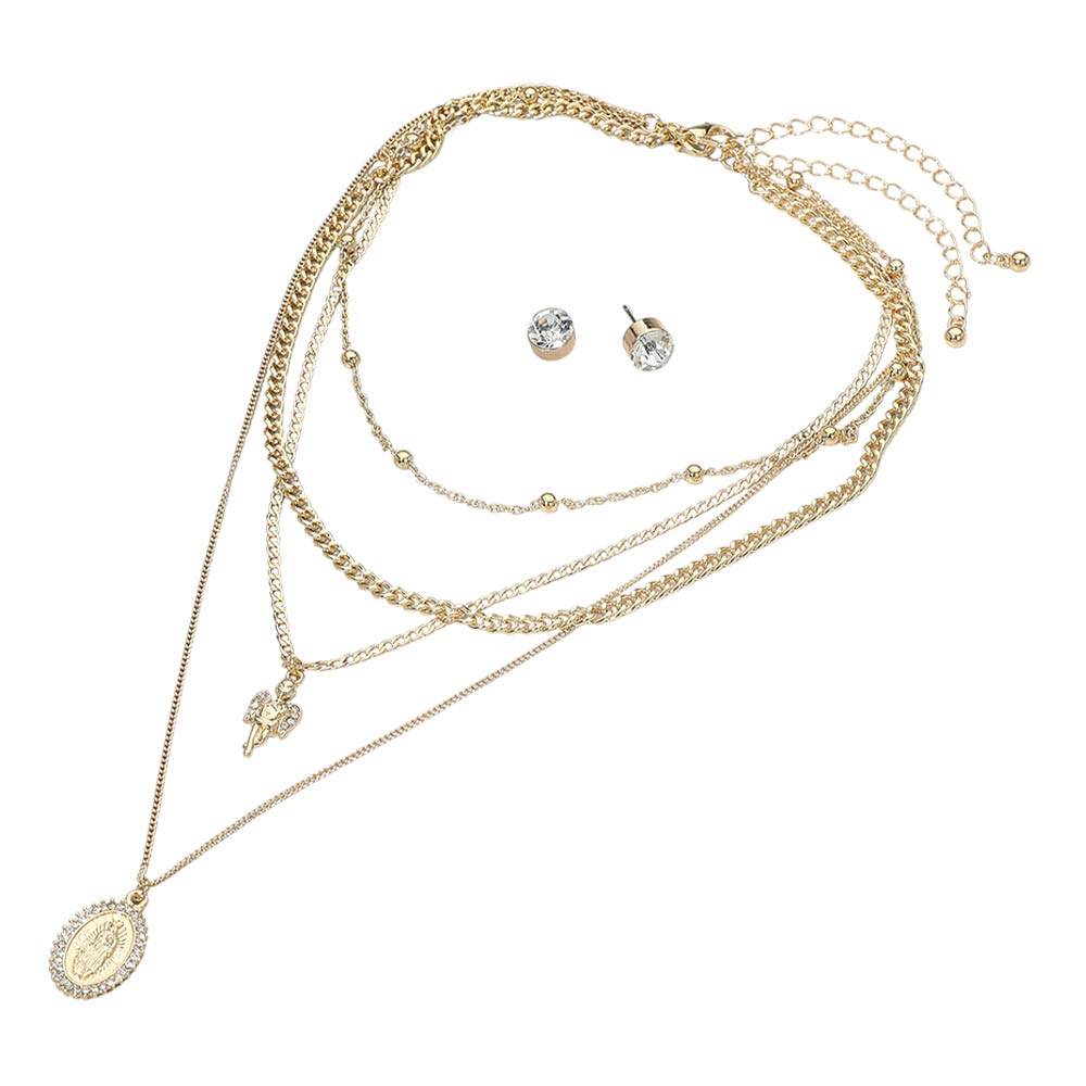 Details • Necklace 1 Size : 13.5" + 3.25" L / 4" L • Necklace 2 Size : 14.5" + 3.25" L / 0.2" L • Earrings Size : 0.3" L • Stylish layered necklace set featuring multiple chains with a detailed religious coin pendant and coordinating stud earrings. The layered design creates an effortless stacked look in one piece, adding dimension and elegance to everyday outfits. Perfect for casual wear, office styling, or special occasions, this versatile jewelry set pairs easily with other accessories and makes a thoughtful gift option for modern, trend-focused collections. • Lead and Nickel Compliant