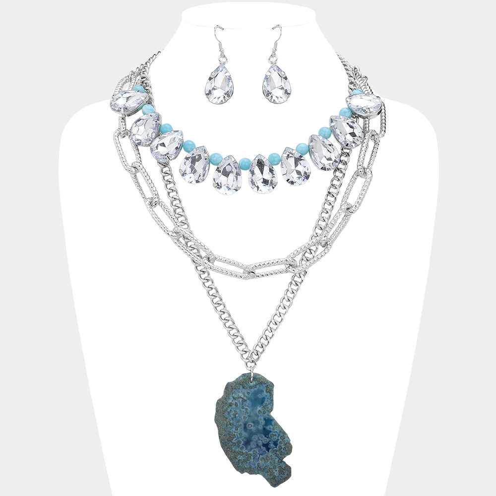 2PCS - Natural Stone Pendant Pointed Teardrop Stone Link Multi Chain Layered Statement Necklace