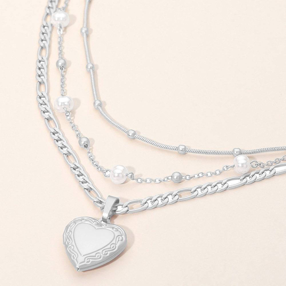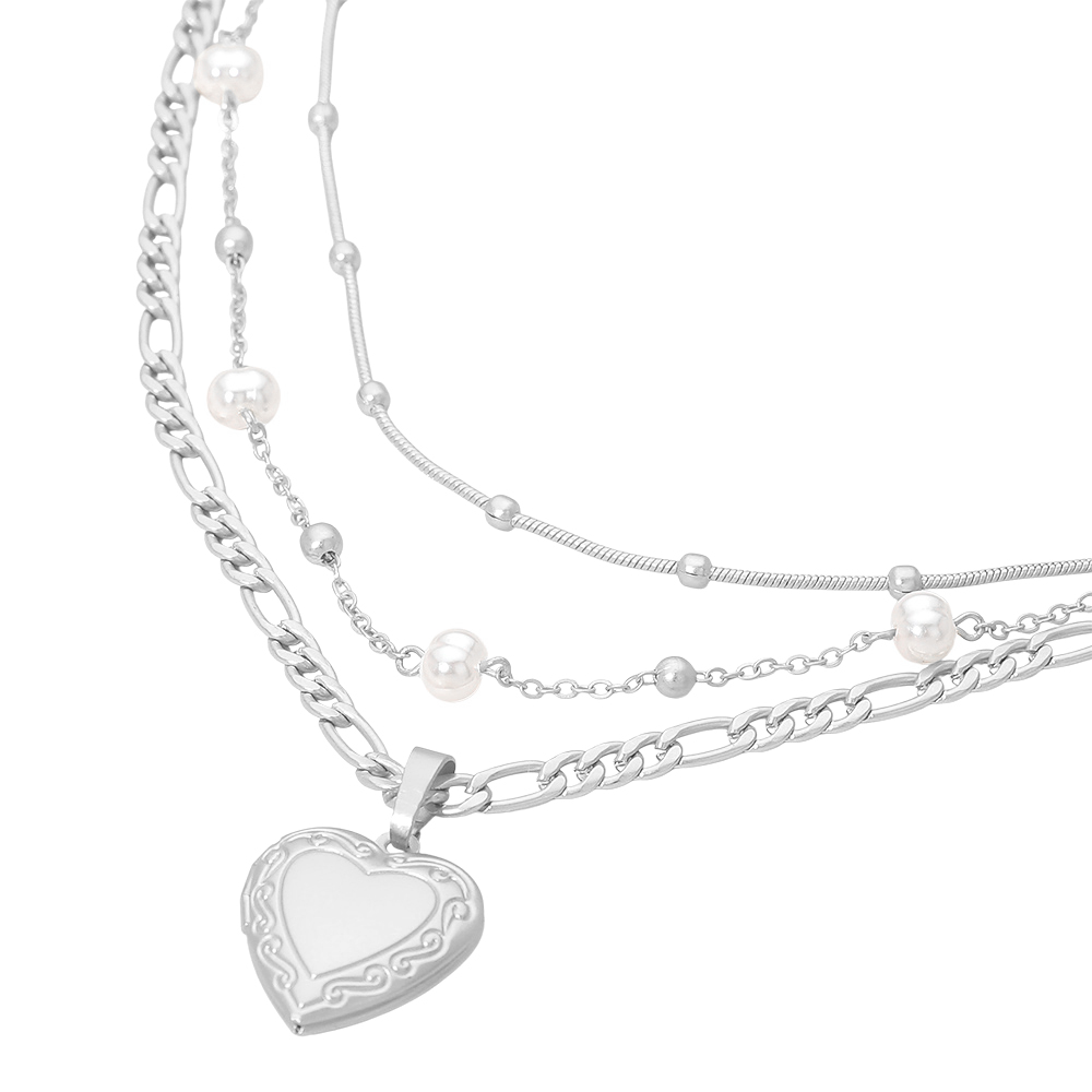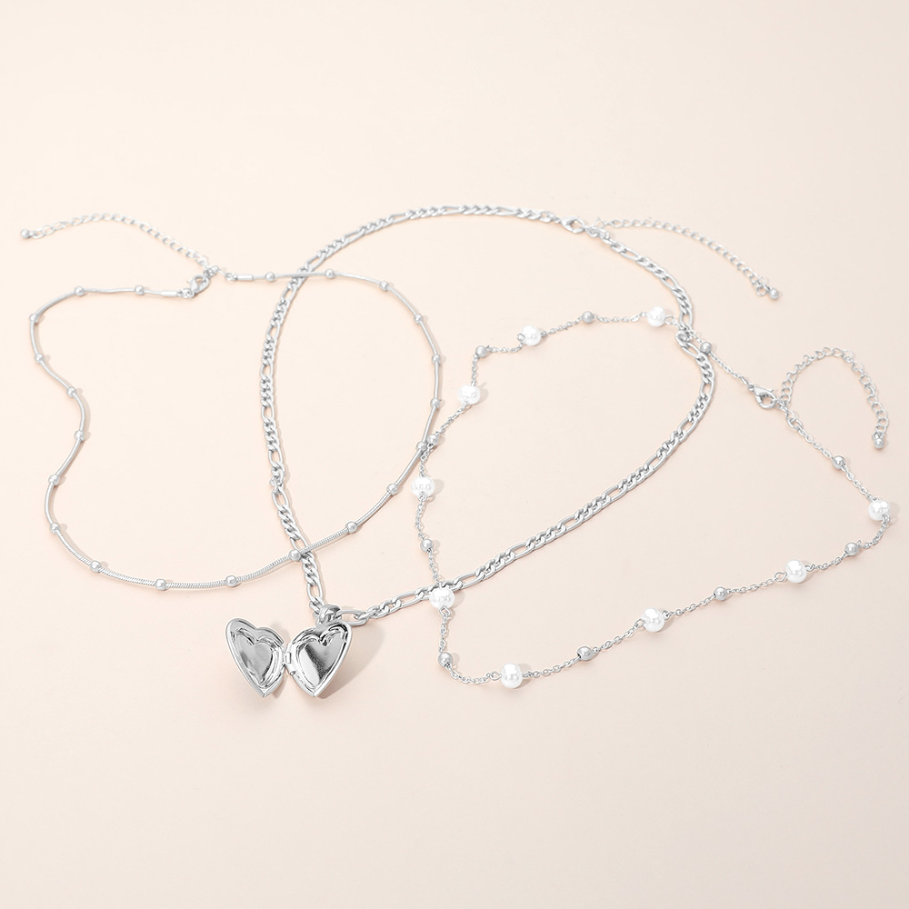 3PCS - Heart Locket Pendant Pearl Station Bead Chain Layered Necklaces