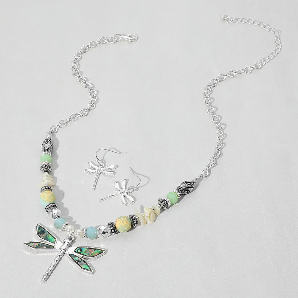 • Elegant jewelry set featuring a dragonfly pendant necklace with matching earrings and a mix of decorative beads. Perfect for adding a whimsical, nature-inspired accent to any outfit or occasion.