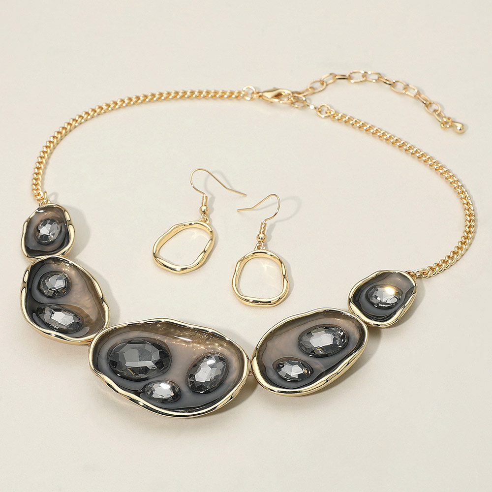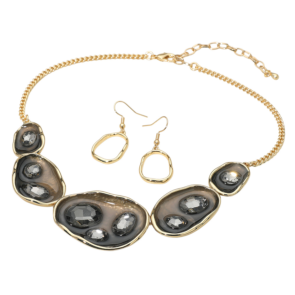 • Contemporary jewelry set featuring a bold necklace and matching earrings with artistic gem accents framed in fluid shapes. Perfect for parties, formal events, or chic everyday wear. A statement-making accessory that combines modern style with elegant sophistication.