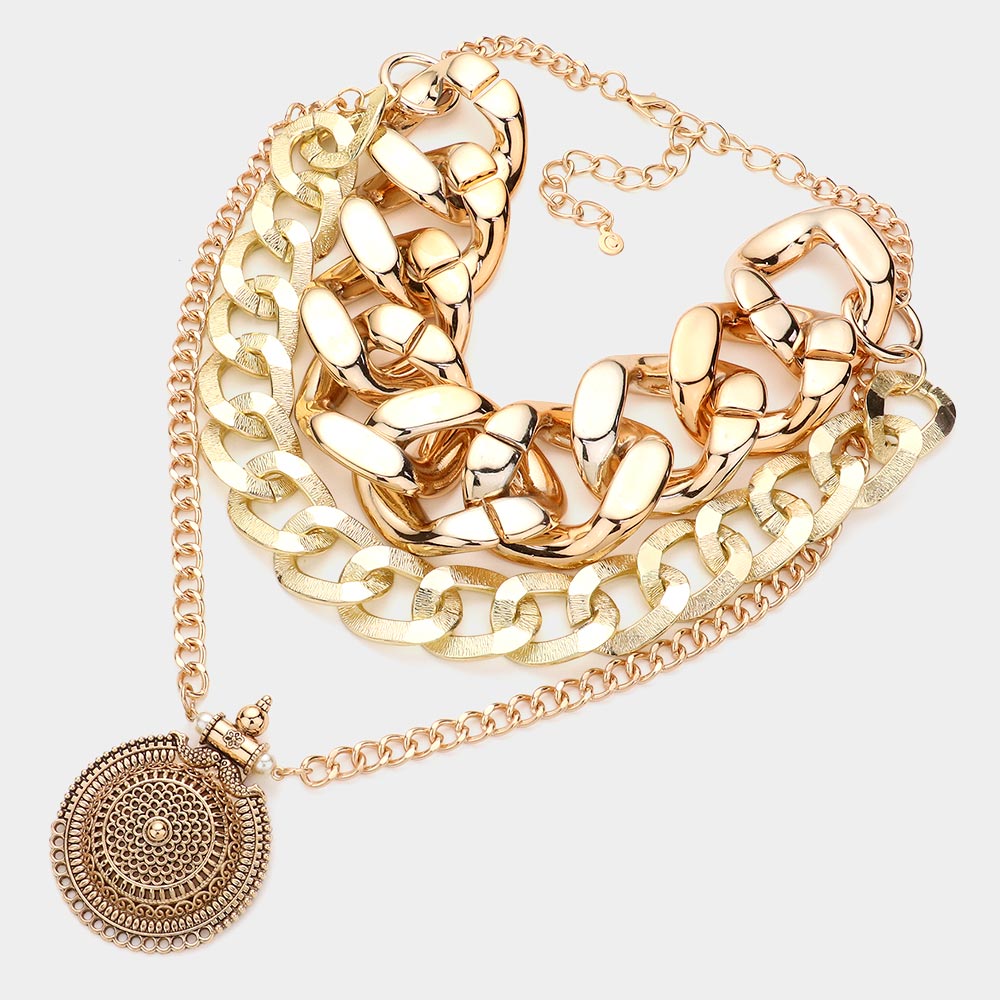 Antique Metal Round Accented Chain Link Statement Necklace
