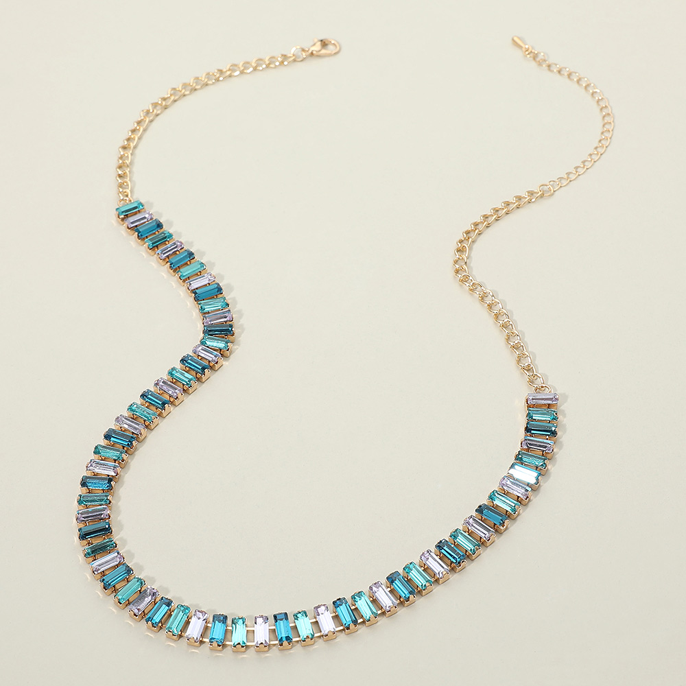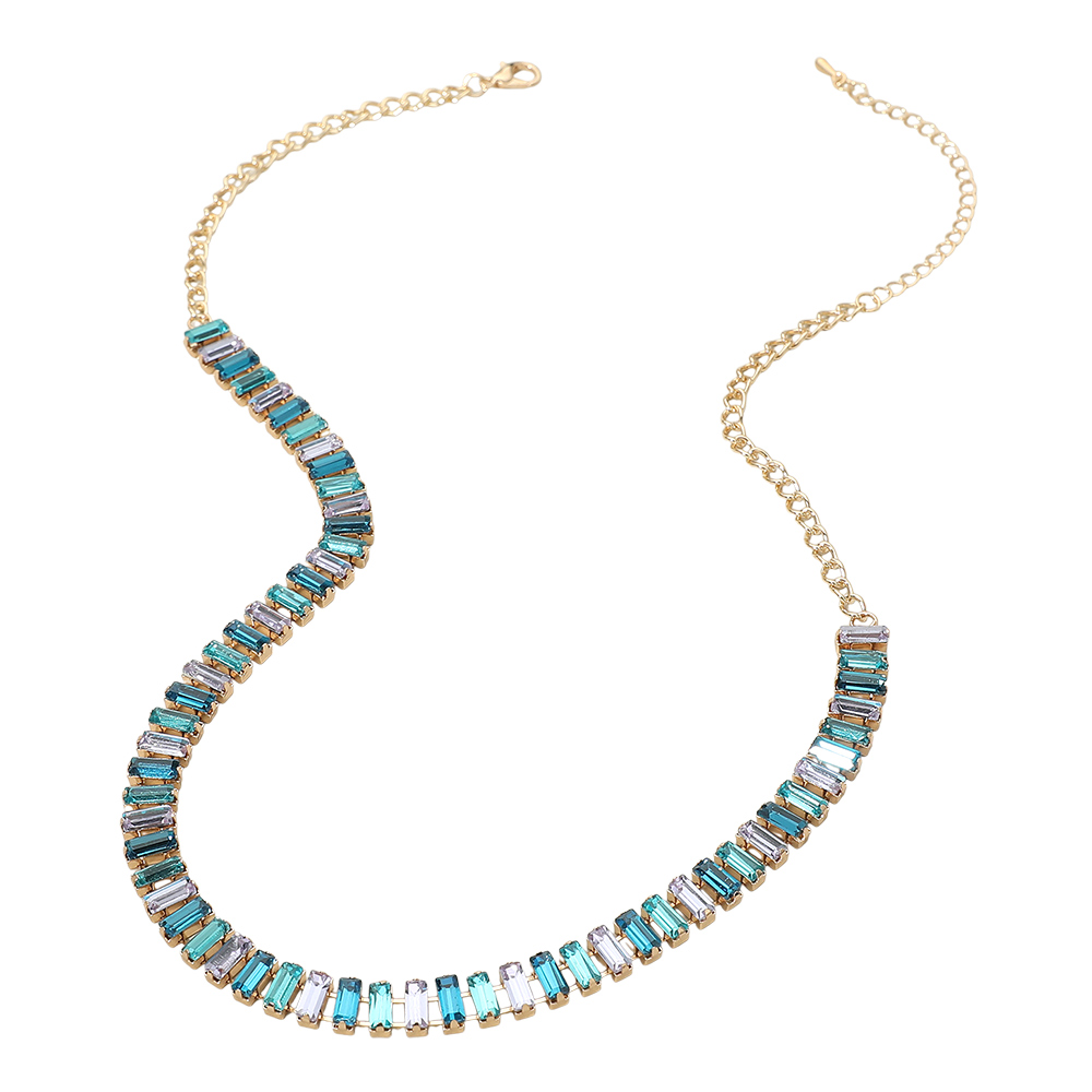 Details • Necklace Size : 18.25" + 3" L • Decor Size : 0.3" L • This statement necklace features a sleek row of baguette style accents arranged along a classic chain for a refined yet eye catching look. Designed to elevate everyday outfits or complete evening styling, it offers a balanced blend of structure and shine. Ideal for layered looks, gift selections, and curated accessory assortments. • Lead and Nickel Compliant