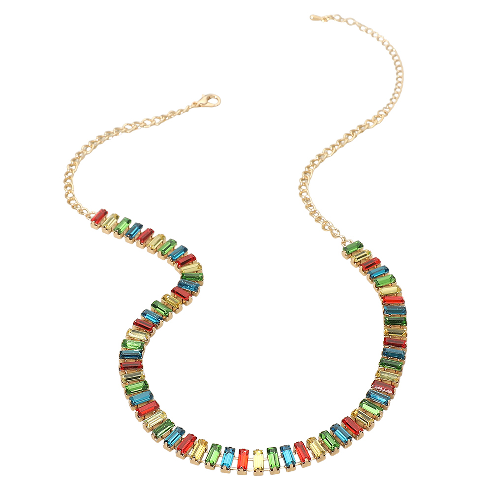 • This statement necklace features a sleek row of baguette style accents arranged along a classic chain for a refined yet eye catching look. Designed to elevate everyday outfits or complete evening styling, it offers a balanced blend of structure and shine. Ideal for layered looks, gift selections, and curated accessory assortments.