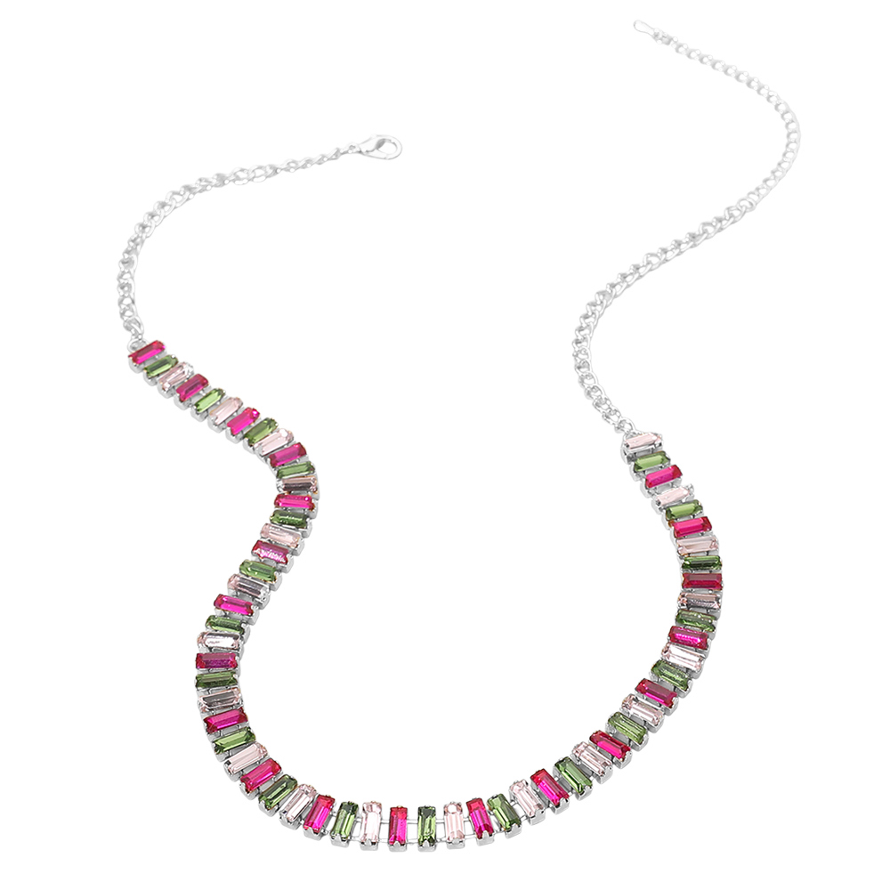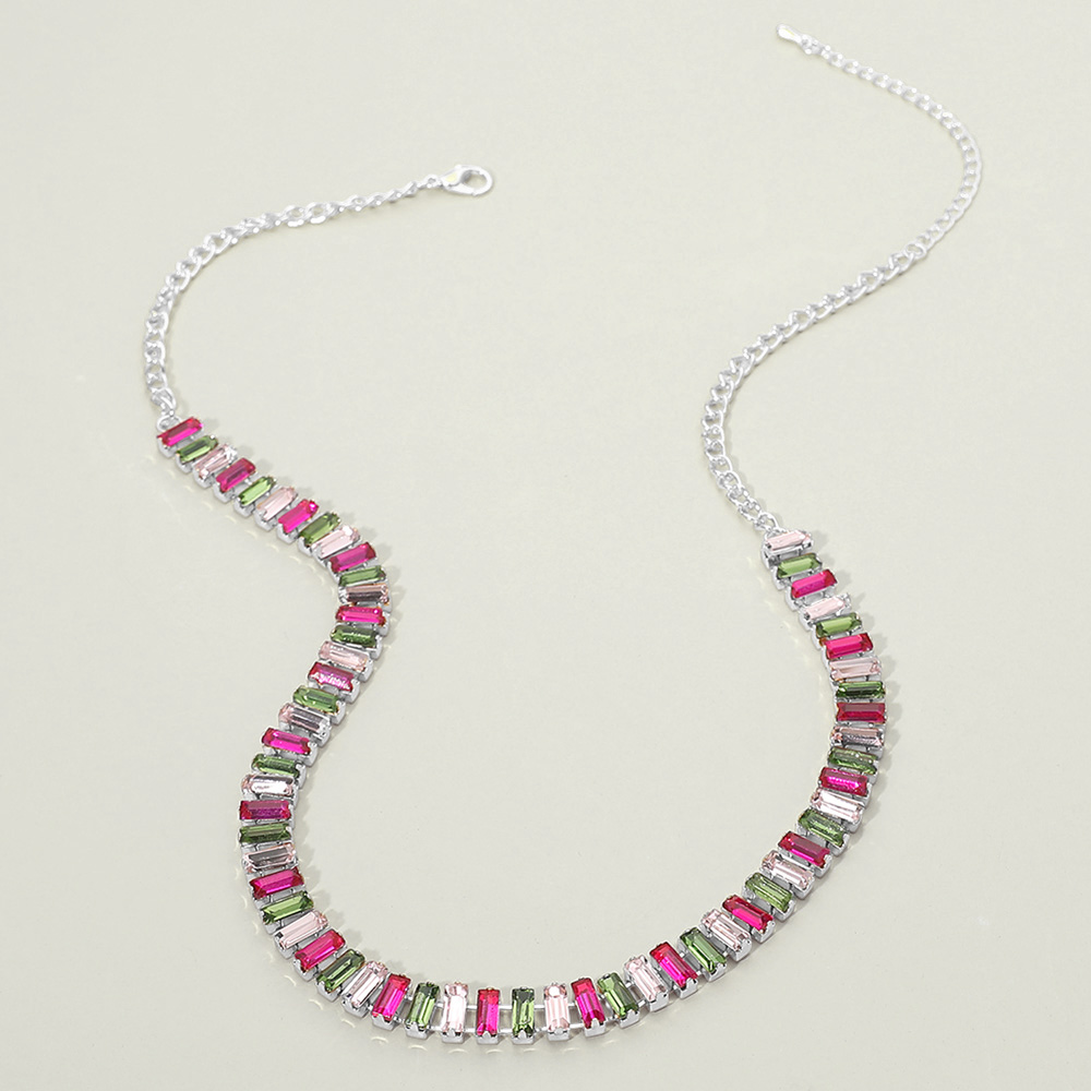 • This statement necklace features a sleek row of baguette style accents arranged along a classic chain for a refined yet eye catching look. Designed to elevate everyday outfits or complete evening styling, it offers a balanced blend of structure and shine. Ideal for layered looks, gift selections, and curated accessory assortments.