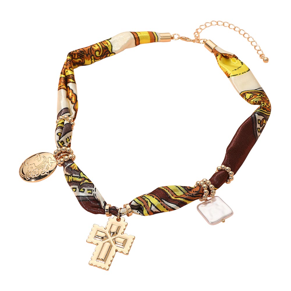 • Make a bold fashion statement with this Charm Pendant Fabric Necklace, featuring a twisted fabric band accented with shimmering beads, a cross charm, and elegant pendants. Perfect for adding a touch of sophistication and individuality to your casual or evening ensembles.