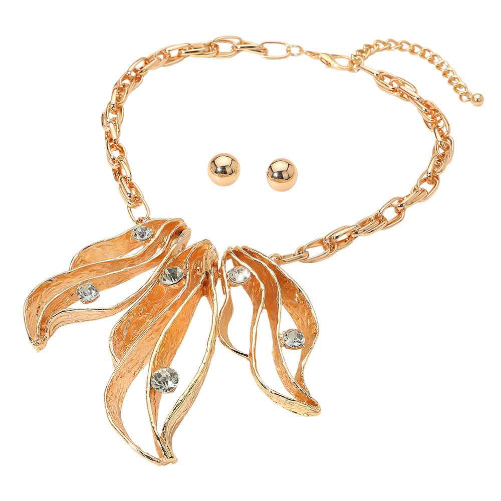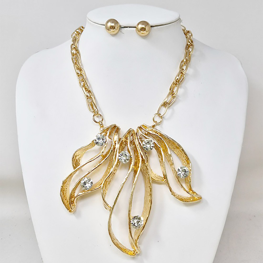 • This abstract leaf statement necklace set captures artistic sophistication with its sculpted openwork design and sparkling crystal accents. Paired with simple stud earrings, it creates a balanced, elegant look perfect for formal occasions or adding a refined touch to everyday style.