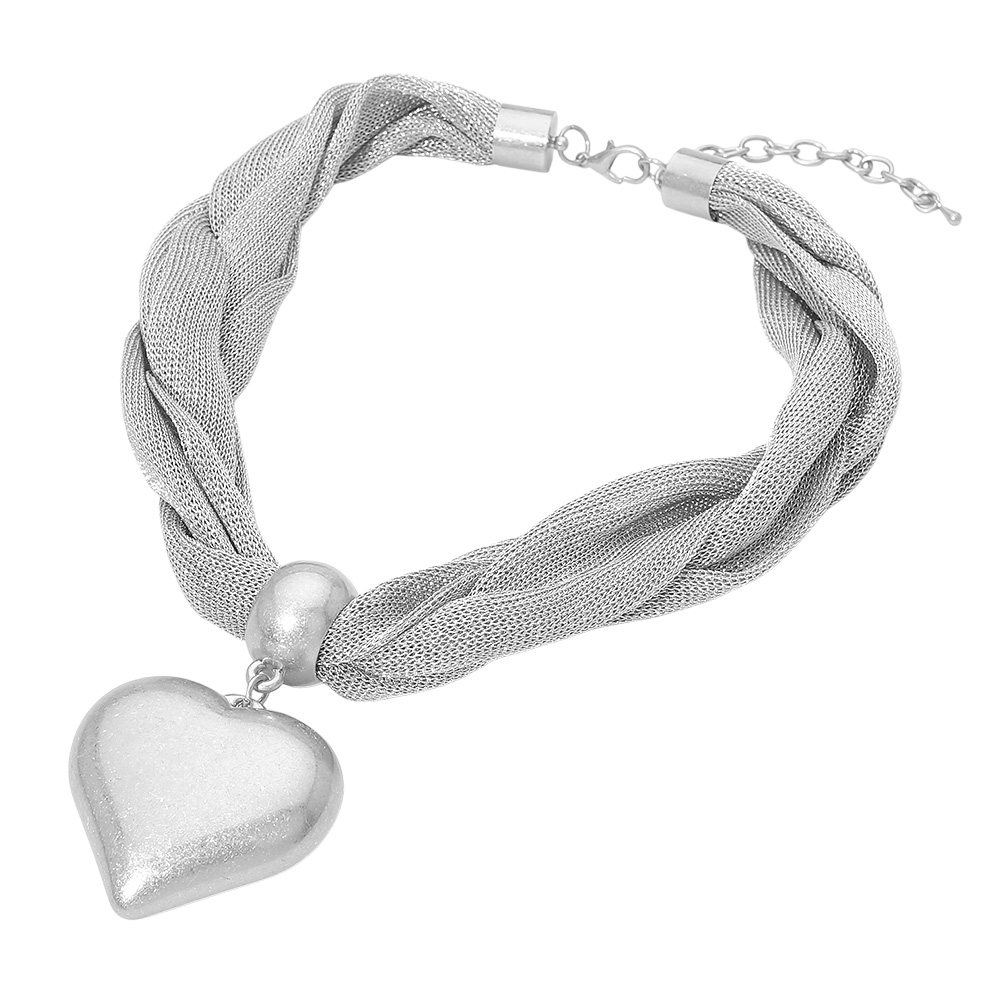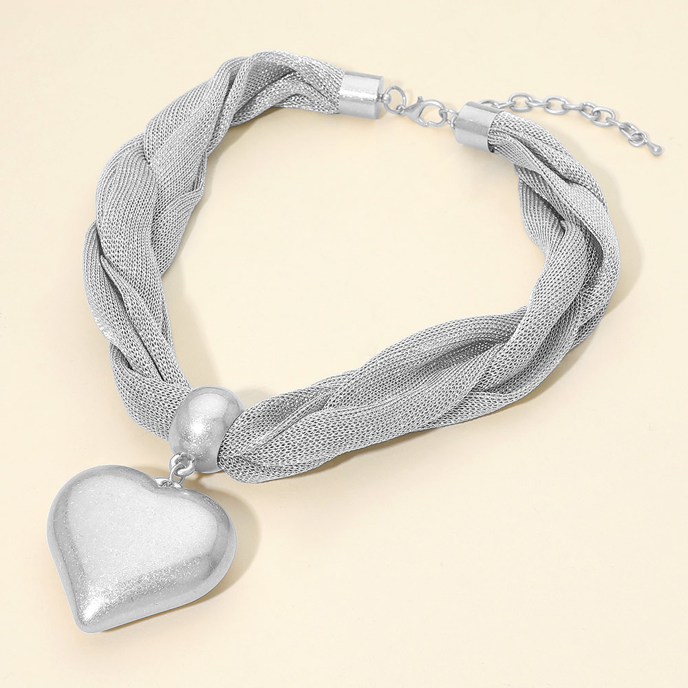 Bold Brushed Metal Heart Pendant Braided Mesh Statement Necklace